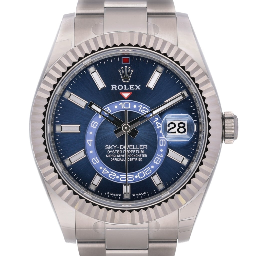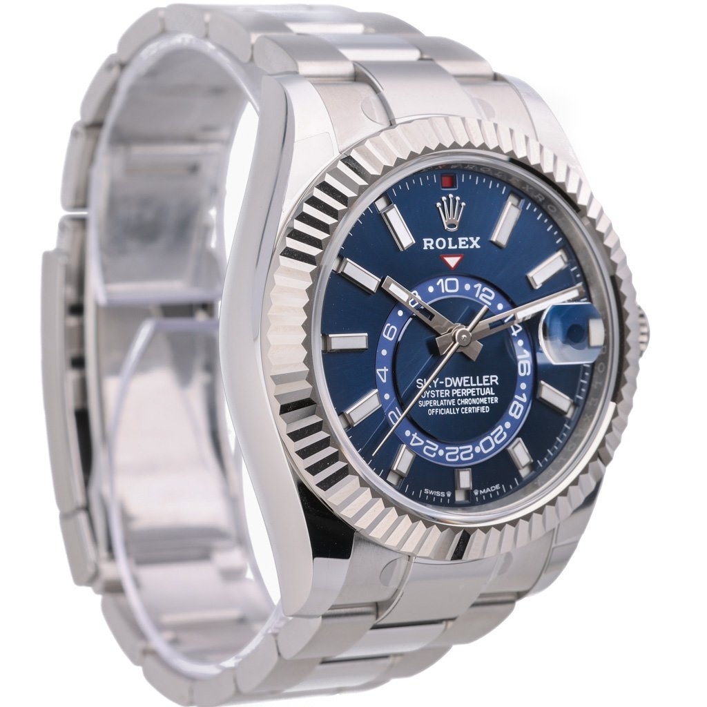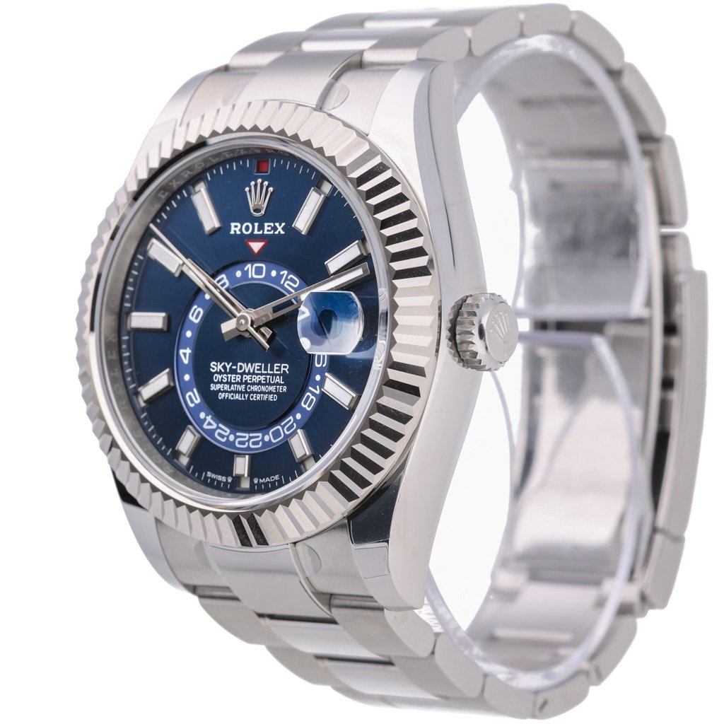 This 2024 Rolex Sky-Dweller reference 336934 is one of the most desirable configurations in the entire Sky-Dweller line, presented here in stainless steel with an 18ct white gold fluted bezel and the highly sought-after blue dial. At 42mm, the case offers a commanding wrist presence while retaining Rolex’s signature balance and refinement. The blue dial provides a striking backdrop for the dual-time display and annual calendar, with crisp chromalight hour markers and the red GMT triangle adding both functionality and visual impact.
