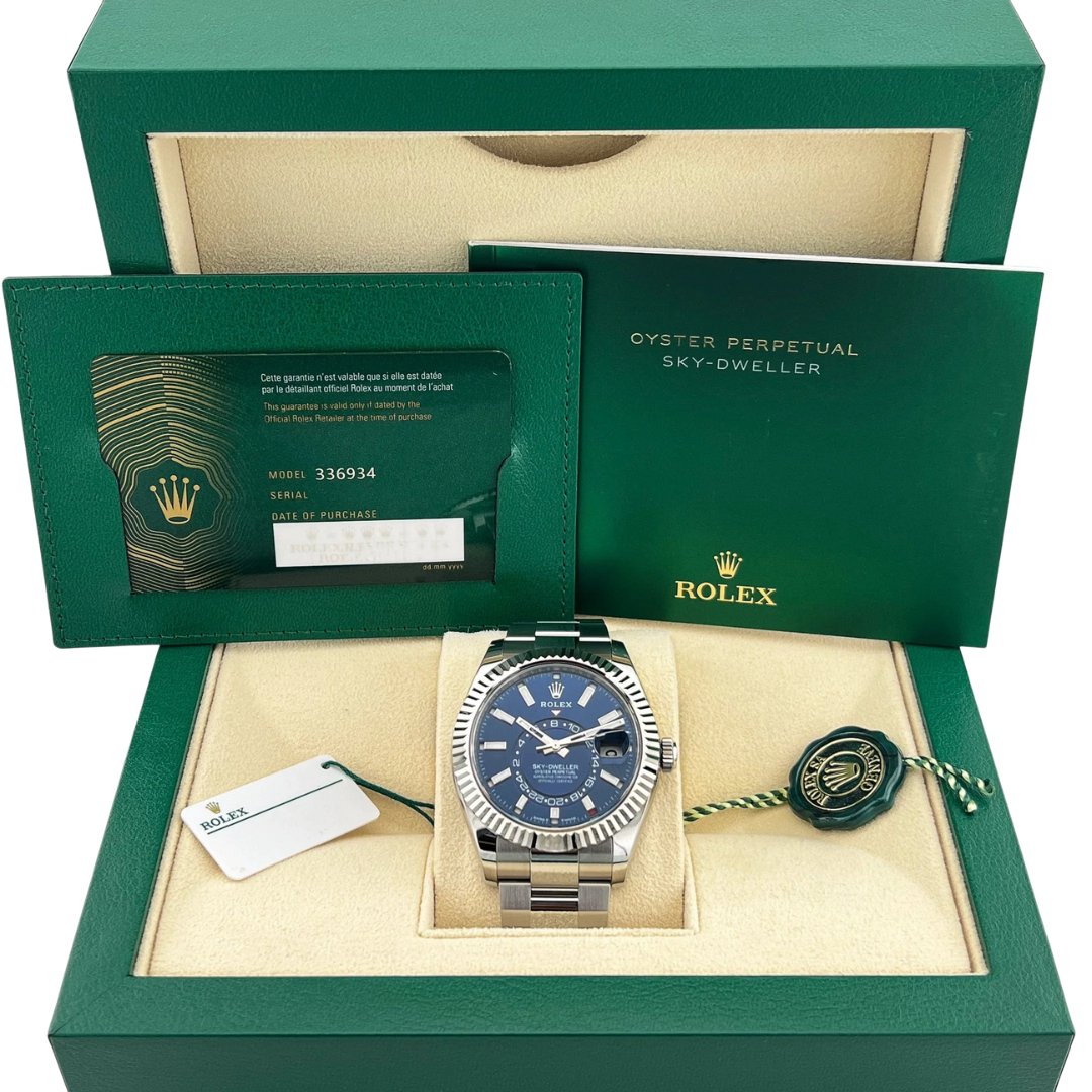 Immaculate and complete with its full set of original Rolex paperwork, this 336934 is covered by the manufacturer's warranty until 2029. Boxed, certified and presented in exceptional condition, it’s a standout opportunity to acquire the most coveted Sky-Dweller variant — a perfect blend of technical mastery, contemporary luxury and unmistakable Rolex prestige.