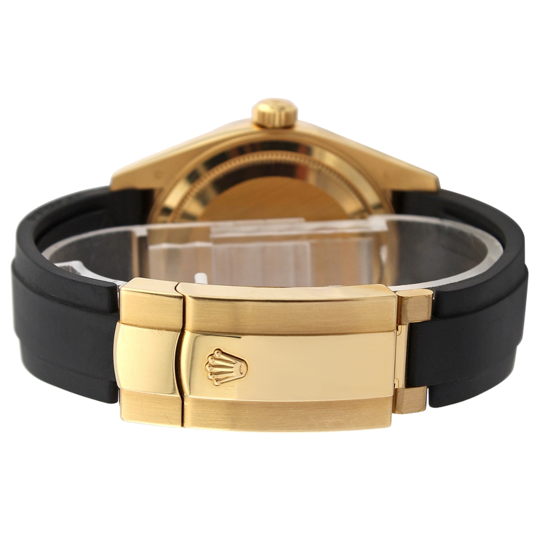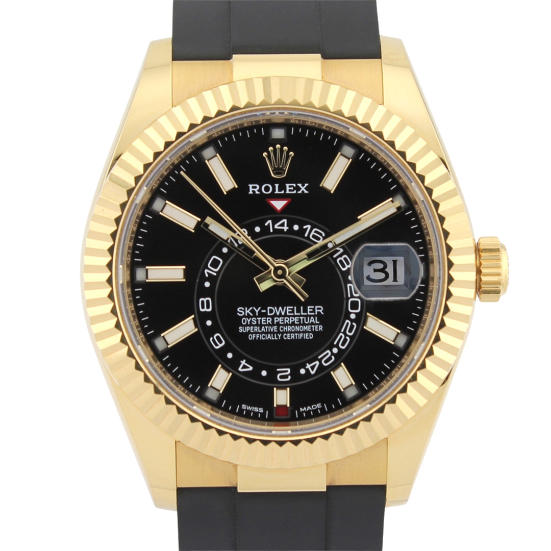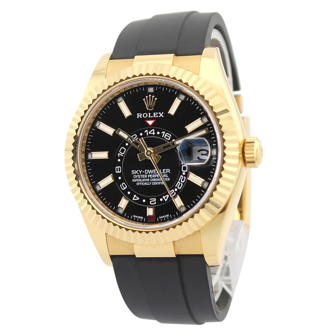 A Rolex Sky-Dweller Watch, Black Oysterflex Rubber Strap with an 18ct Yellow Gold Case & Clasp on a Black Dial.