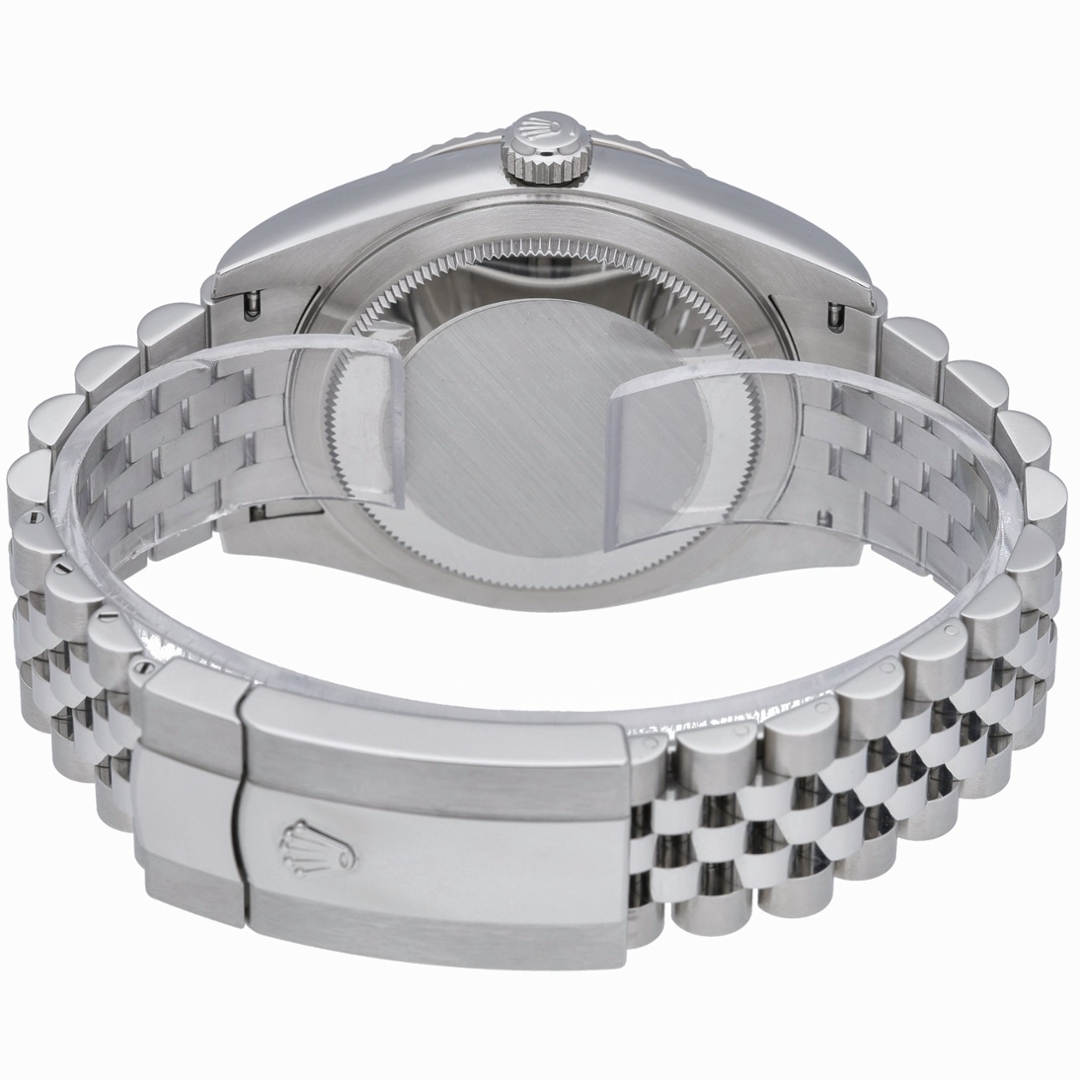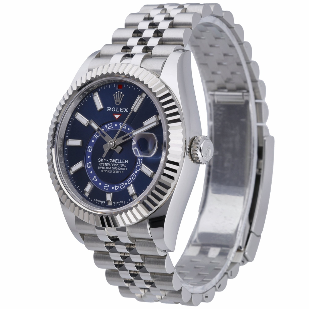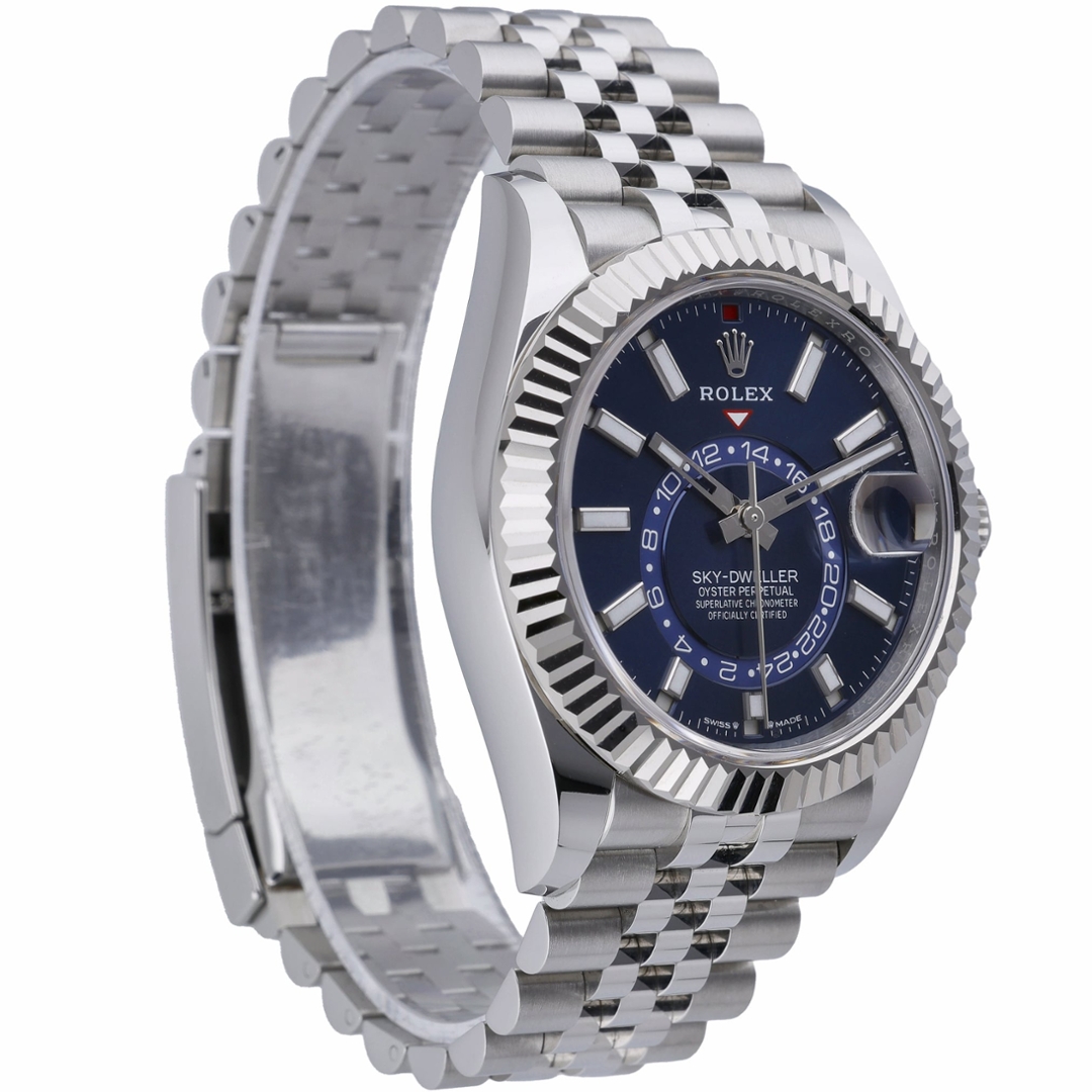 A Rolex Sky-Dweller is presented in stainless steel with an 18ct white gold fluted bezel, offering a refined take on Rolex’s most technically advanced annual calendar watch. The 42mm Oyster case is paired with the robust Jubilee bracelet, balancing everyday wearability with unmistakable presence. The sunburst blue dial delivers depth and clarity, featuring luminous baton hour markers, an off-centre 24-hour disc for dual time display, and the signature month indicator discreetly integrated around the dial’s perimeter.