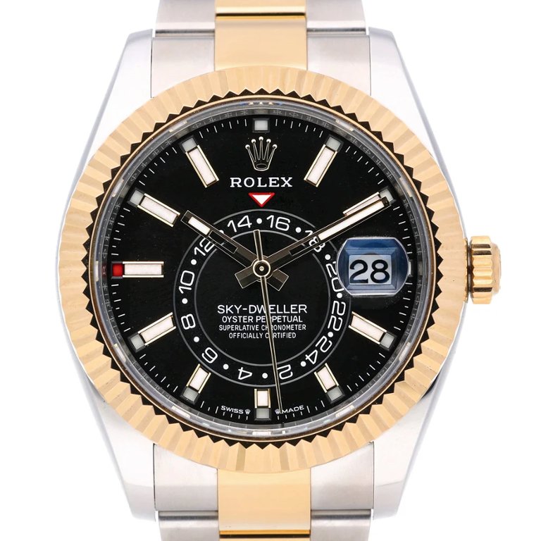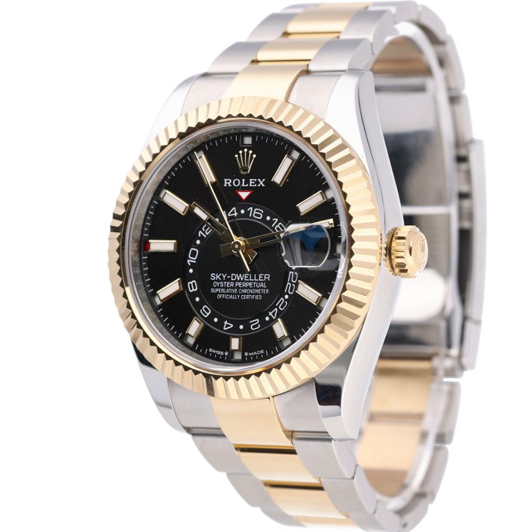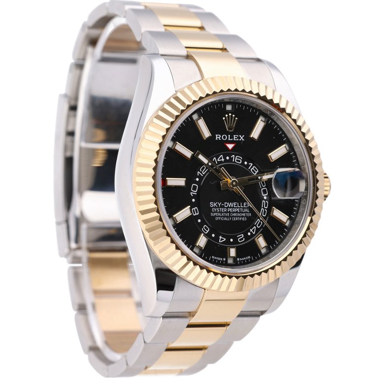 This Rolex Sky-Dweller reference 336933 is presented in immaculate condition, crafted in a bi-metal combination of stainless steel and solid 18ct yellow gold. The 42mm Oyster case is paired with Rolex’s signature fluted Ring Command bezel, allowing intuitive adjustment of the annual calendar and dual time functions. The black dial provides strong contrast, featuring applied luminous hour markers, the off-centre 24-hour disc, and the date display positioned beneath the Cyclops lens at 3 o’clock.