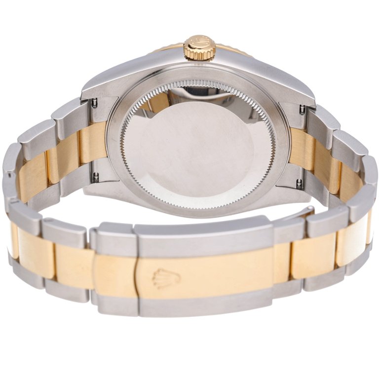 Powering the watch is the Rolex Calibre 9002 automatic movement, offering a 72-hour power reserve, Chronergy escapement, Parachrom hairspring, and Superlative Chronometer certification to −2/+2 seconds per day. The movement supports the Saros annual calendar system, automatically distinguishing between 30- and 31-day months, requiring adjustment only once per year. The Oyster bracelet combines steel outer links with a solid yellow gold centre link, secured by a folding Oysterclasp with Easylink extension.