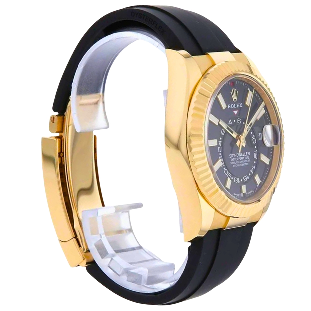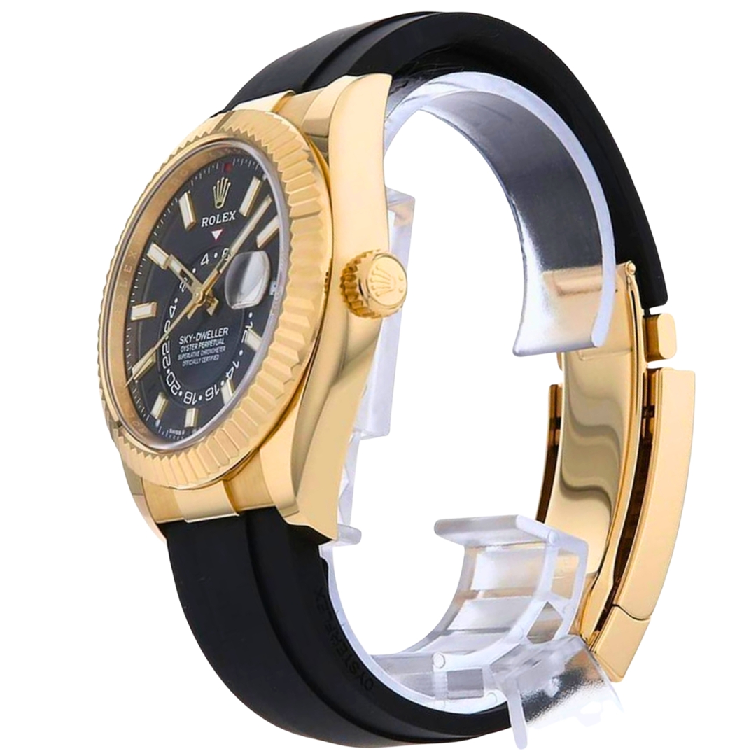 A Rolex Sky-Dweller Watch, Black Rubber Strap with an 18ct Yellow Gold Case & Clasp with an 18ct Yellow Gold Fluted Bezel on a Black Dial