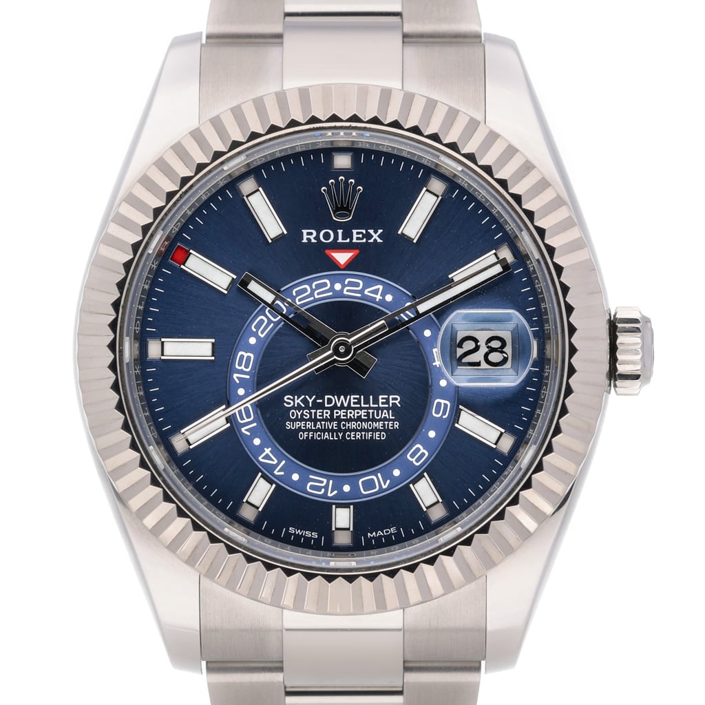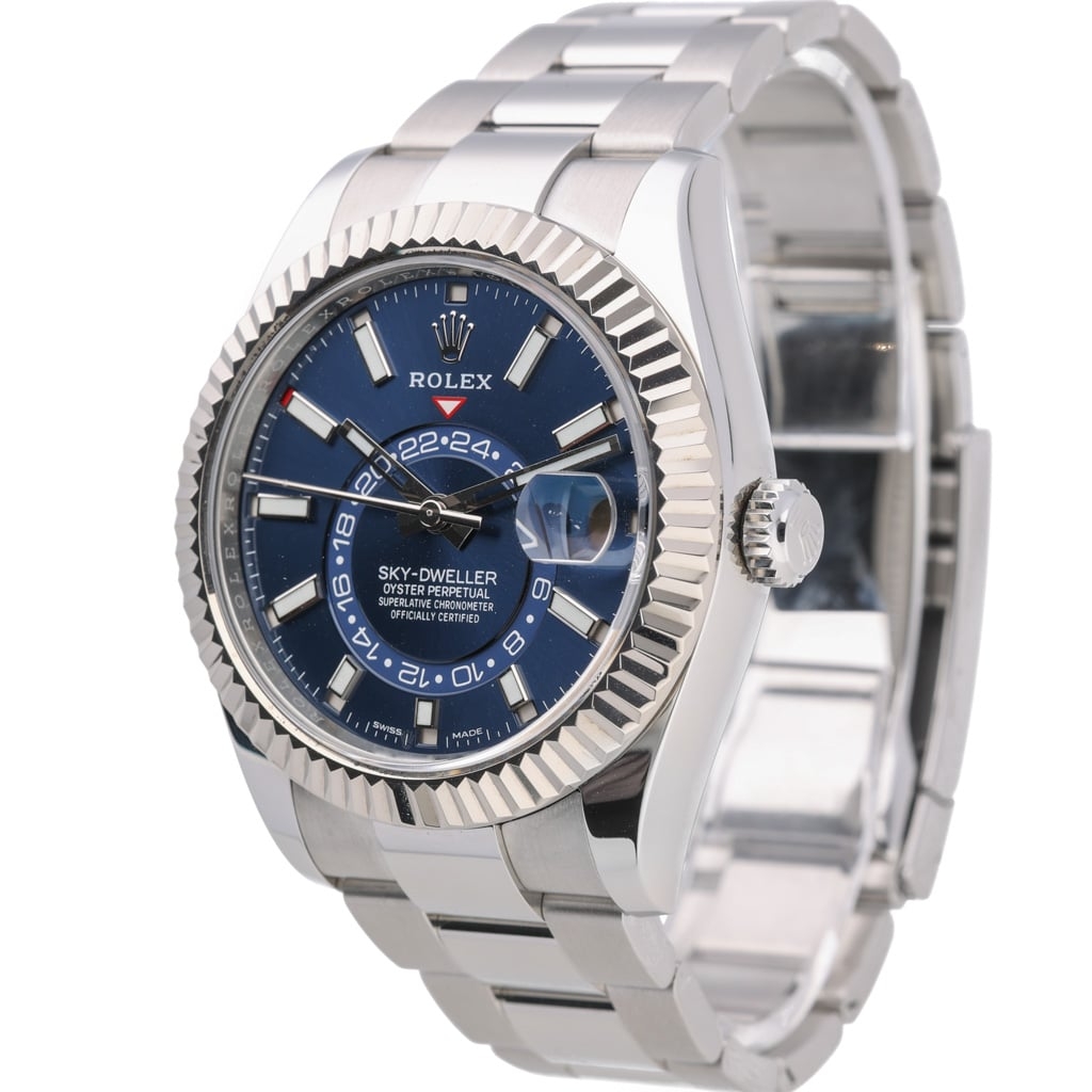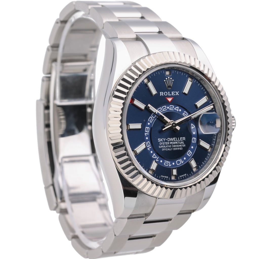 A Rolex Sky-Dweller reference 336934 in stainless steel with an 18ct white gold fluted bezel, featuring a 42mm Oyster case with a bold and contemporary presence. The blue sunburst dial is enhanced by applied baton hour markers and polished hands with Chromalight display, while the off-centre 24-hour disc and annual calendar apertures provide a distinctive and highly functional layout.