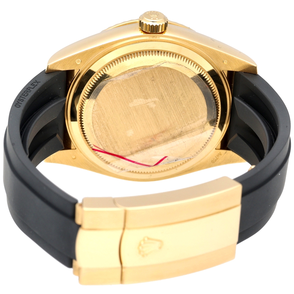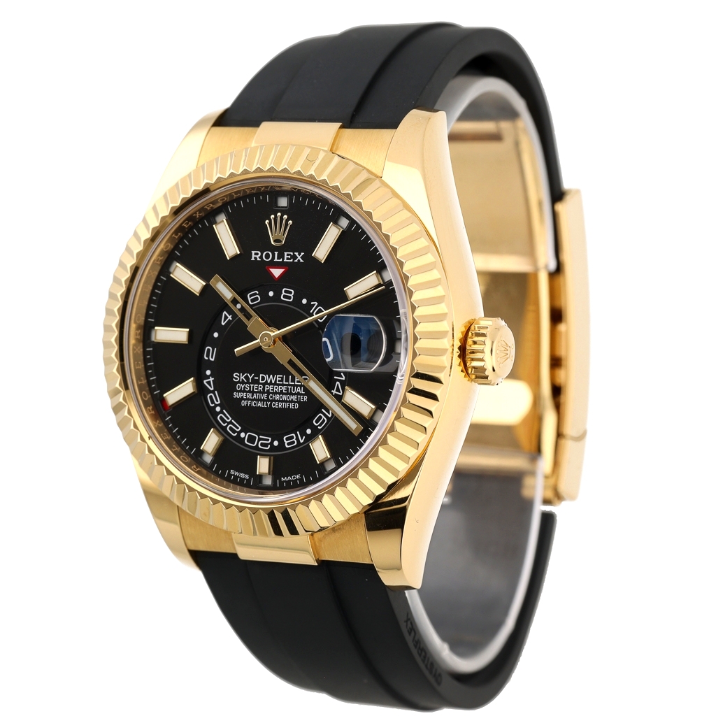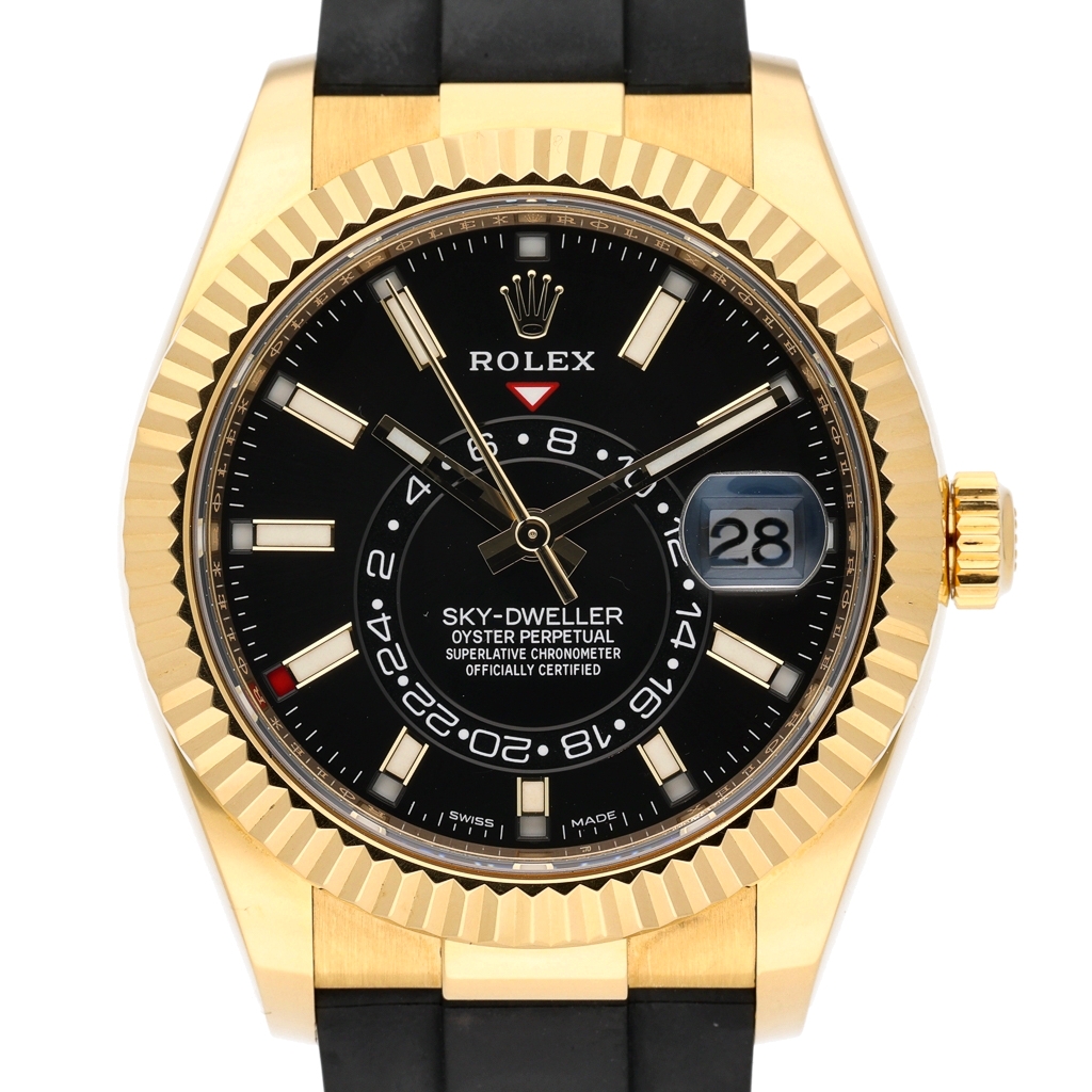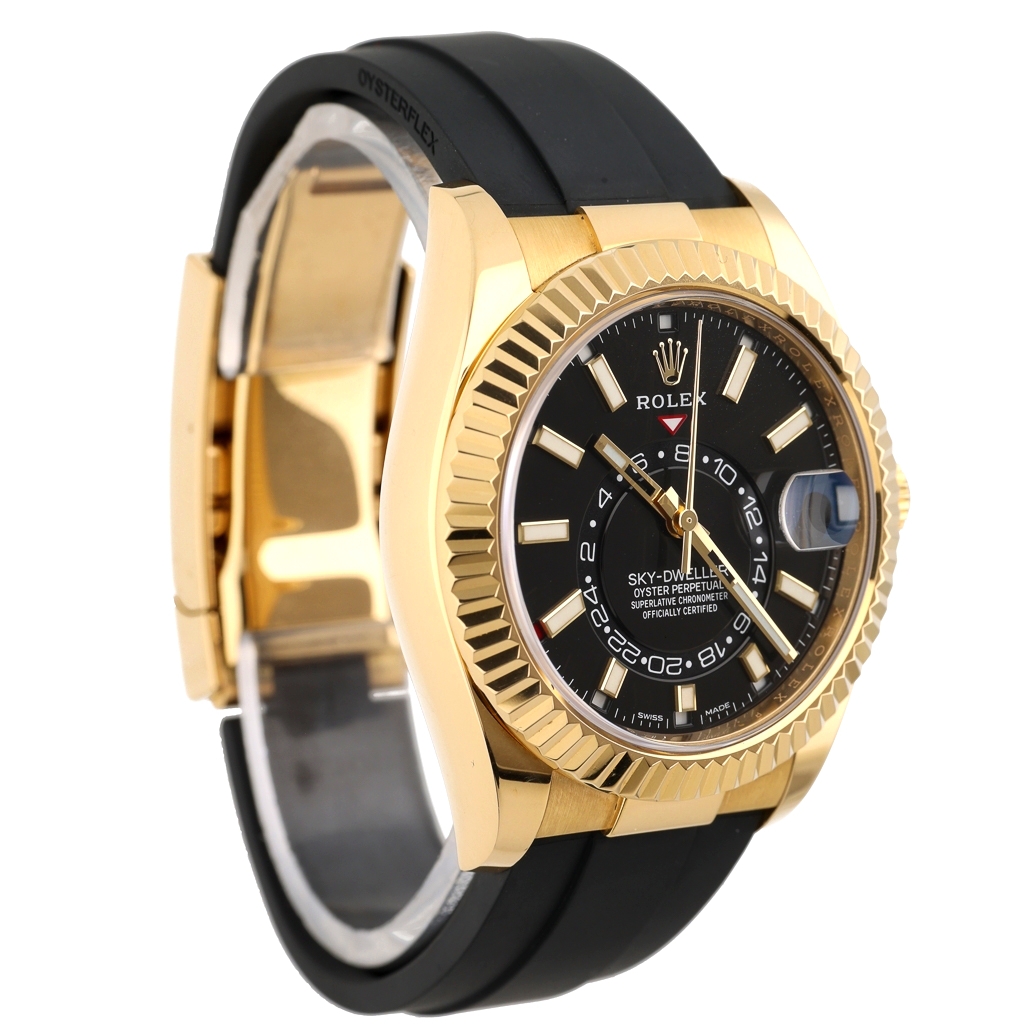 A Rolex Sky-Dweller reference 326238 in full 18ct yellow gold, fitted to a black Oysterflex bracelet with matching yellow gold clasp and presented on a black dial. This 2021 example is offered in immaculate condition and combines the prestige of precious metal with the contemporary sport-luxury feel of the Oysterflex configuration. The commanding fluted bezel complements the 42mm case, while the matte black dial provides a sharp contrast against the warmth of yellow gold, delivering a strong wrist presence with refined balance.
