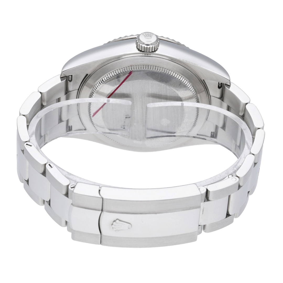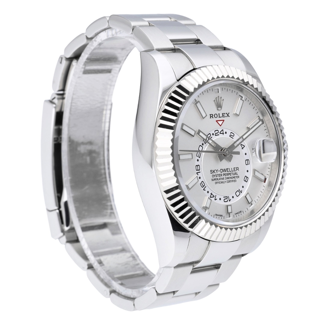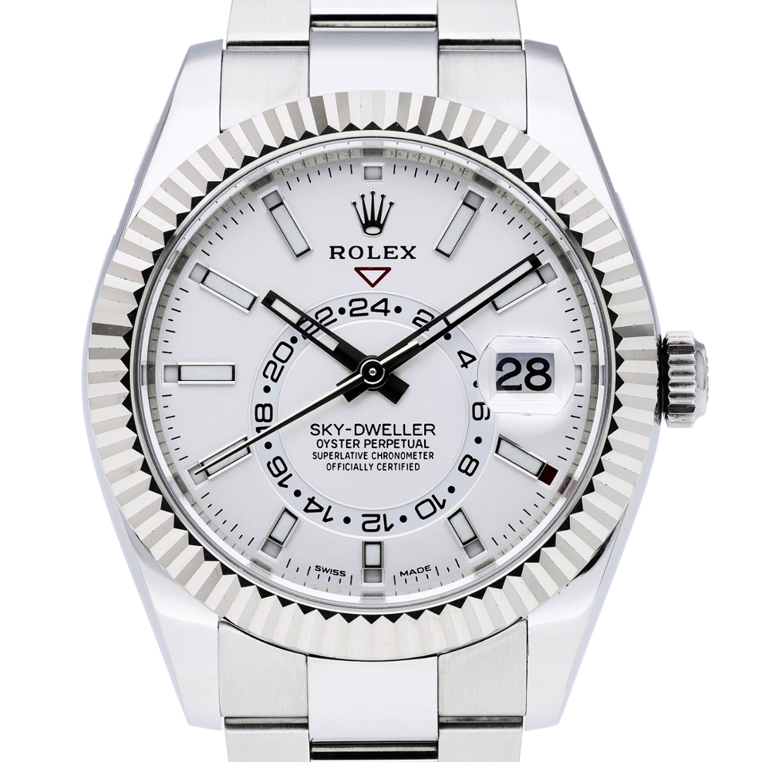 A Rolex Sky-Dweller 326934 is presented in stainless steel with an 18ct white gold fluted bezel, paired with a crisp white dial that highlights the model’s distinctive annual calendar layout. The 42mm Oyster case offers a strong yet balanced presence on the wrist, while luminous baton hour markers, off-centre 24-hour disc and the month indication around the dial provide excellent clarity and intuitive functionality.