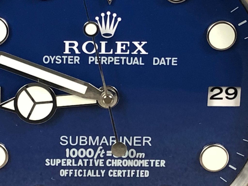 A stainless steel replica Rolex blue face Submariner wall clock with sweeping second hand and functional date. Approx 14" height, 14" width.