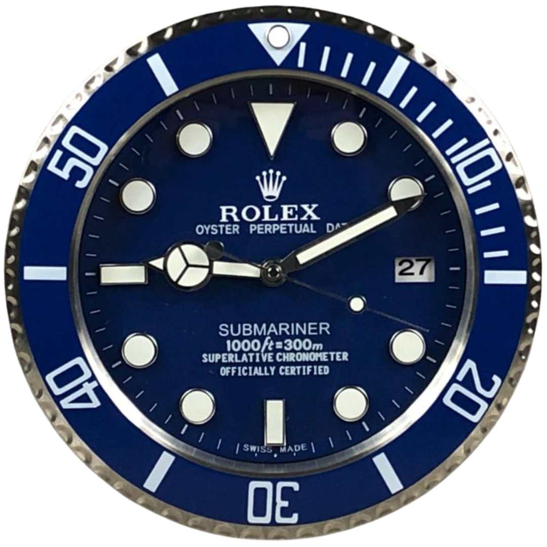 A stainless steel replica Rolex Submariner wall clock, presented with a striking blue dial and matching blue bezel that delivers a bold and contemporary take on this iconic dive watch design. The luminous-style hour markers, Mercedes hands, and unidirectional bezel detailing combine to create a highly recognisable aesthetic, while the rich blue tones add depth and standout visual appeal.