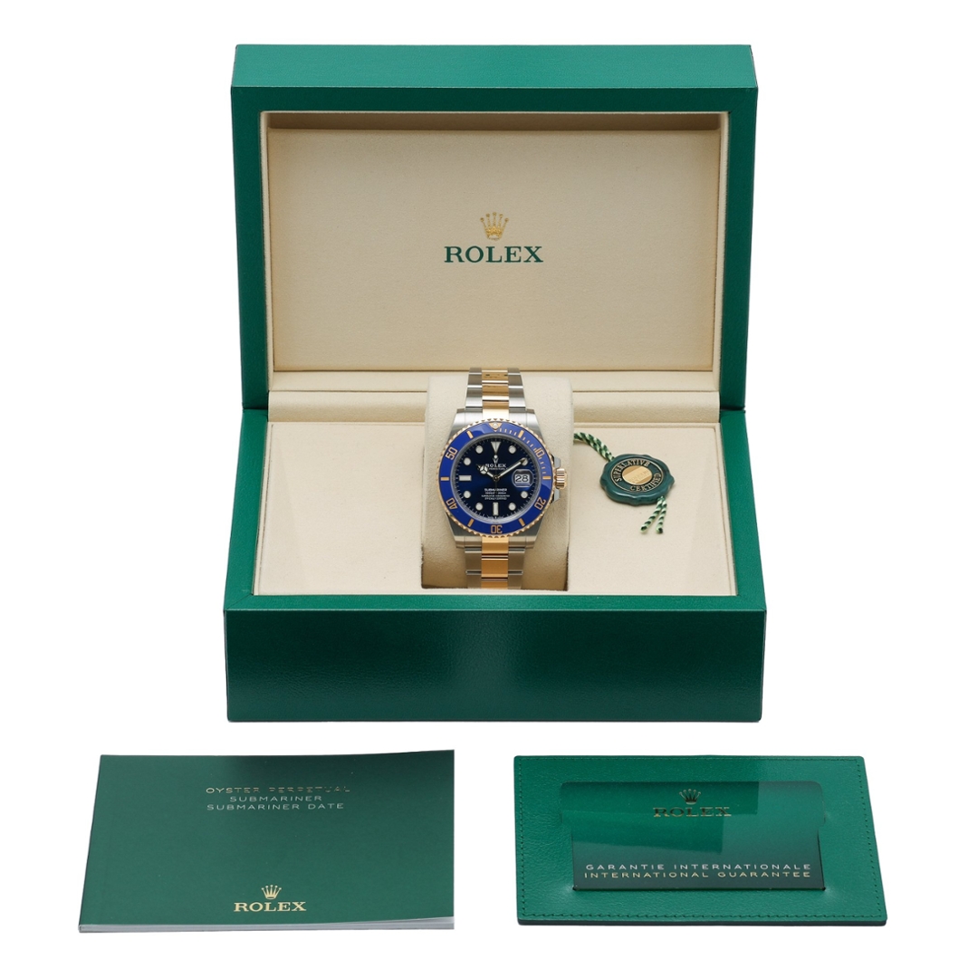 A bi-metal Rolex Submariner 126613LB, crafted from stainless steel and 18ct yellow gold, is a timeless masterpiece that blends luxury with performance. Featuring a striking blue bezel and matching blue dial, this 41-mm timepiece evolves the classic Submariner design, offering a bold yet sophisticated aesthetic that stands out in any collection.