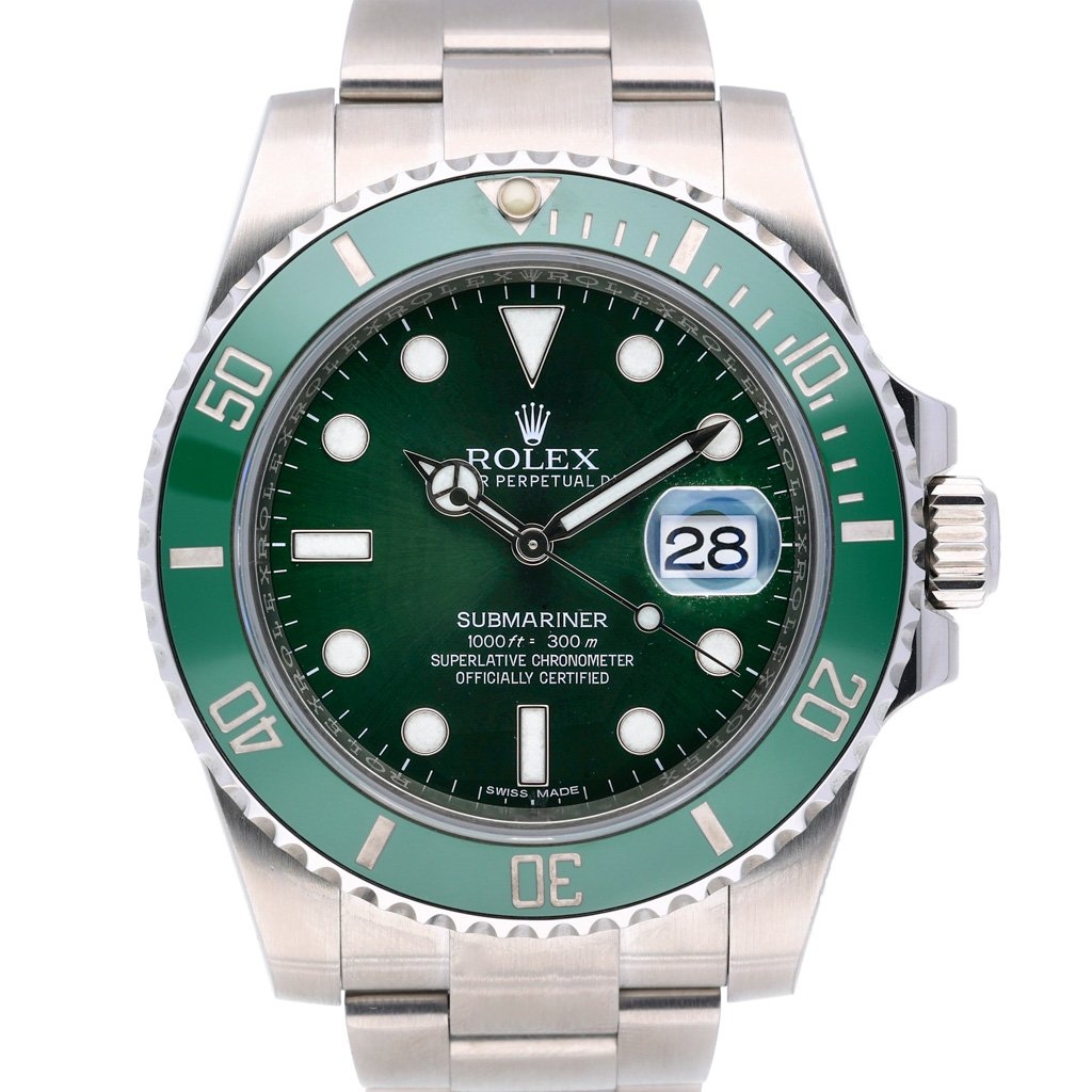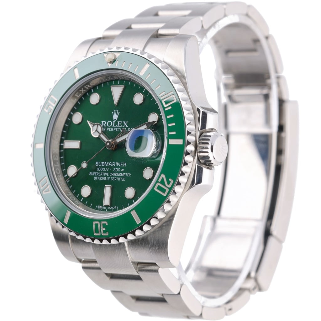 A Rolex Submariner 116610LV, affectionately known as the "Hulk," is a rare and highly coveted timepiece prized by collectors for its bold design and exclusivity. Discontinued by Rolex, this stainless steel model with its vibrant green ceramic bezel and matching sunburst green dial has become a modern classic. The distinctive colourway and timeless 40mm case design set it apart, making it an unmistakable icon in the world of luxury watches.