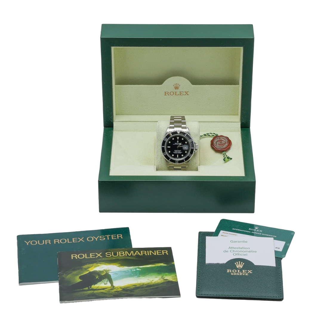 A Rolex Submariner, model 16610, is a legendary dive watch known for its precision, durability, and timeless style. Crafted in 2008, this immaculate timepiece features a 40mm stainless steel case that exudes strength and sophistication. Its black bezel and matching black dial create a classic and sleek design that remains one of the most recognisable in the world of luxury watches. The dial features luminous hour markers, ensuring optimal readability in low-light conditions, a hallmark of the Submariner’s professional abilities.