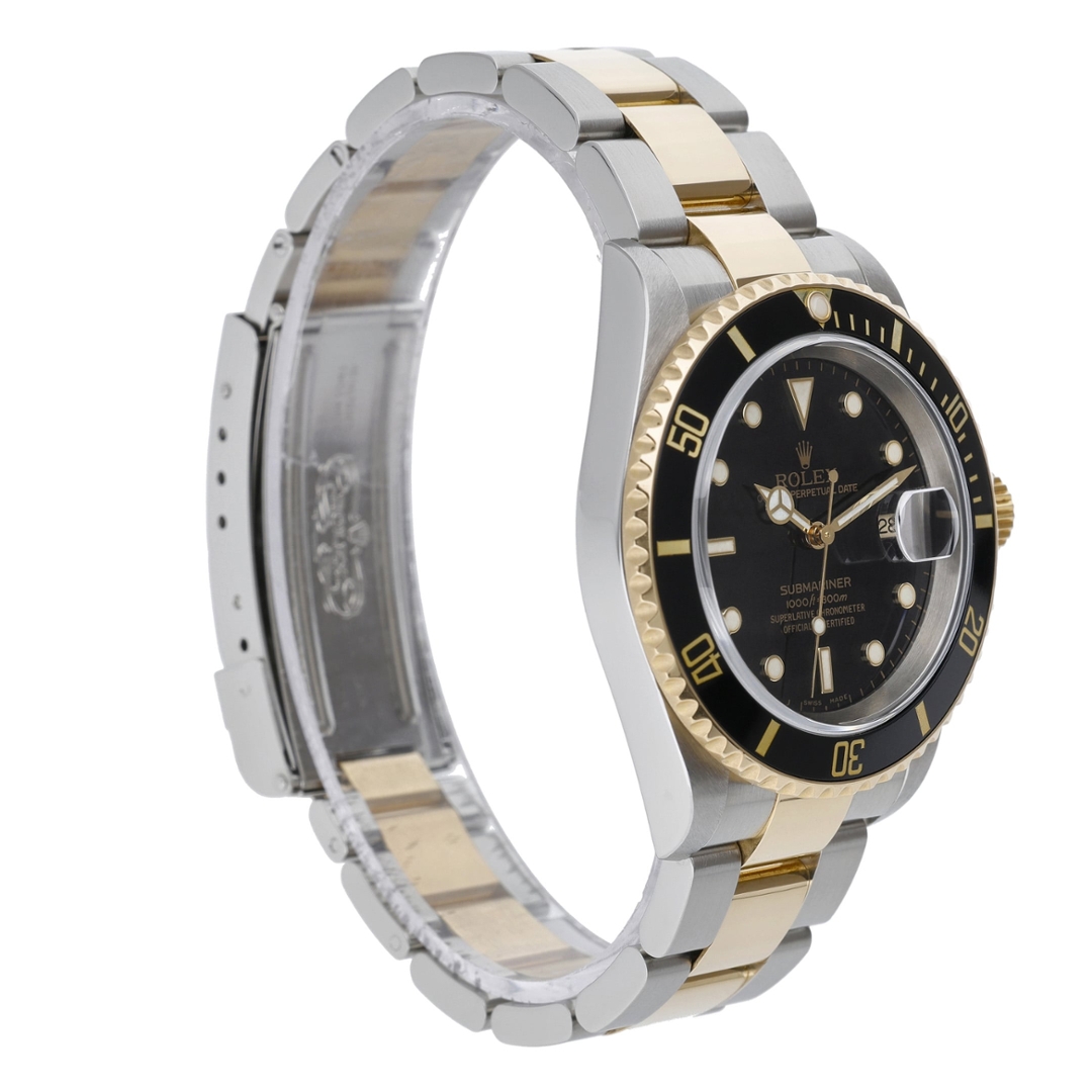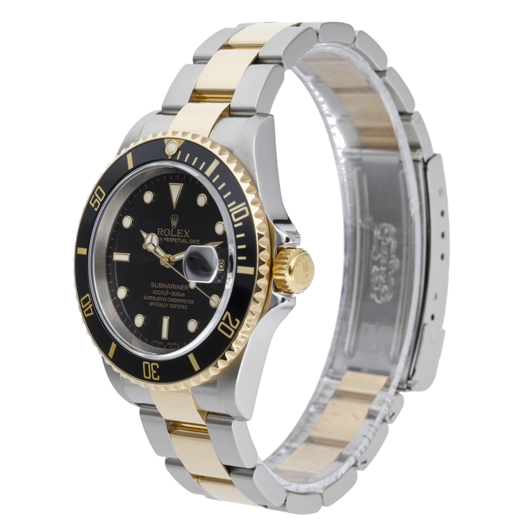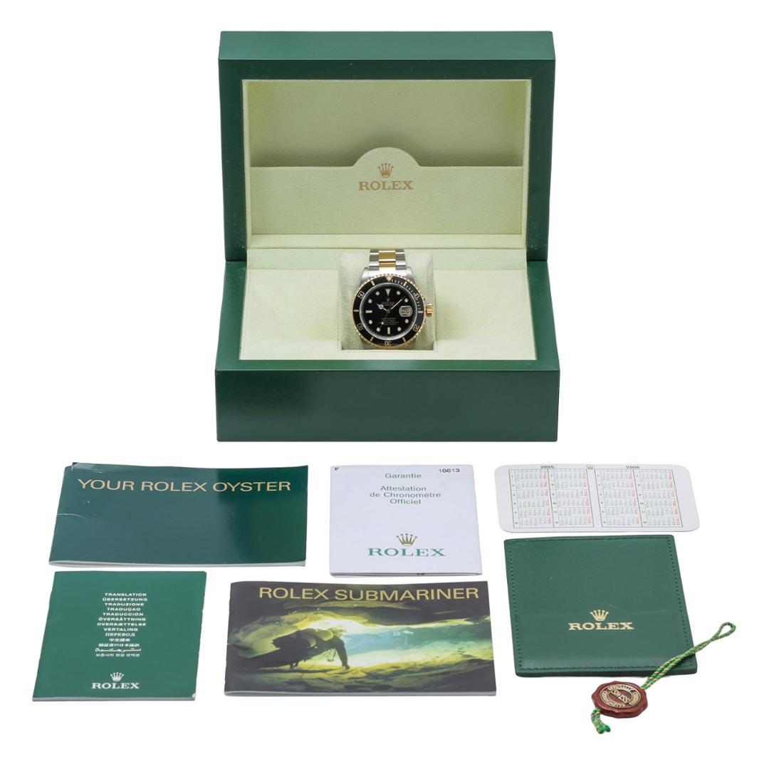 A Rolex Submariner 16613LN, released in 2005, is a classic example of the brand's legendary craftsmanship and timeless design. This particular model is a bi-metal variant, combining the strength of stainless steel with the luxury of 18ct yellow gold, creating a striking contrast that exudes both durability and elegance. The 40mm case is the perfect size, providing a substantial presence on the wrist without being overwhelming. Its black bezel and matching dial are both iconic and versatile, offering a sleek, refined appearance that suits any occasion.