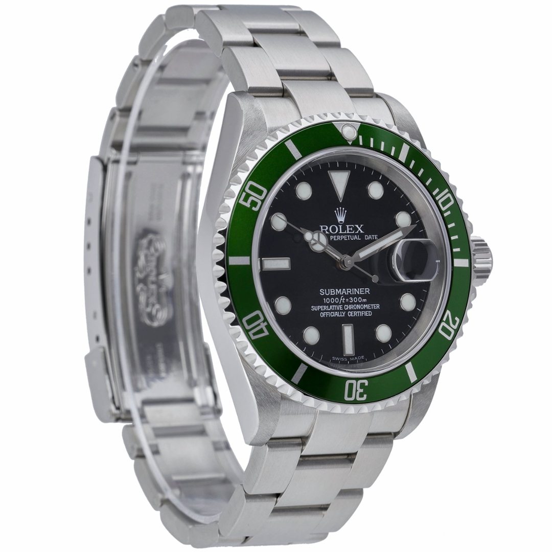 A Rolex Submariner Watch, Stainless Steel with a Green Bezel and Black Dial.