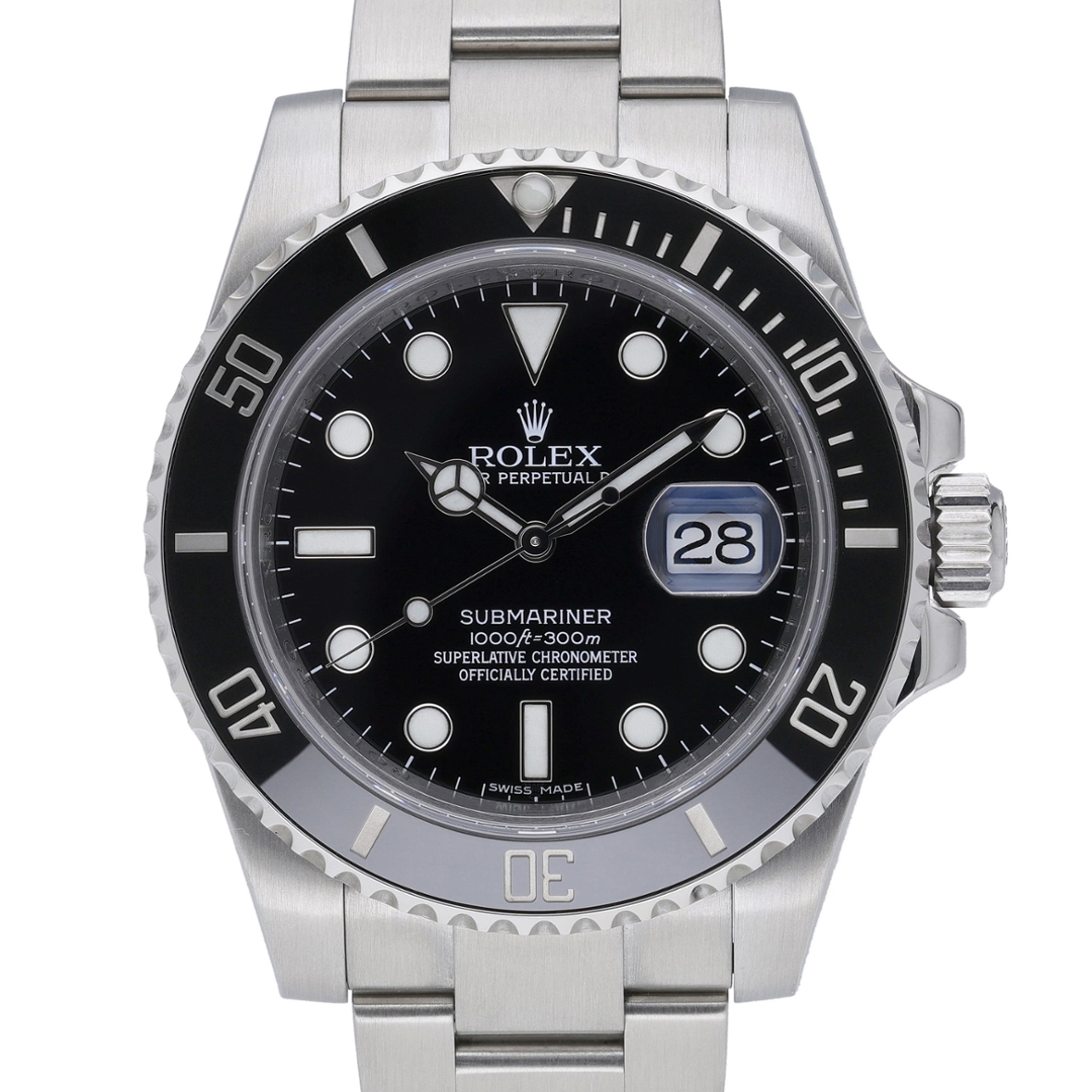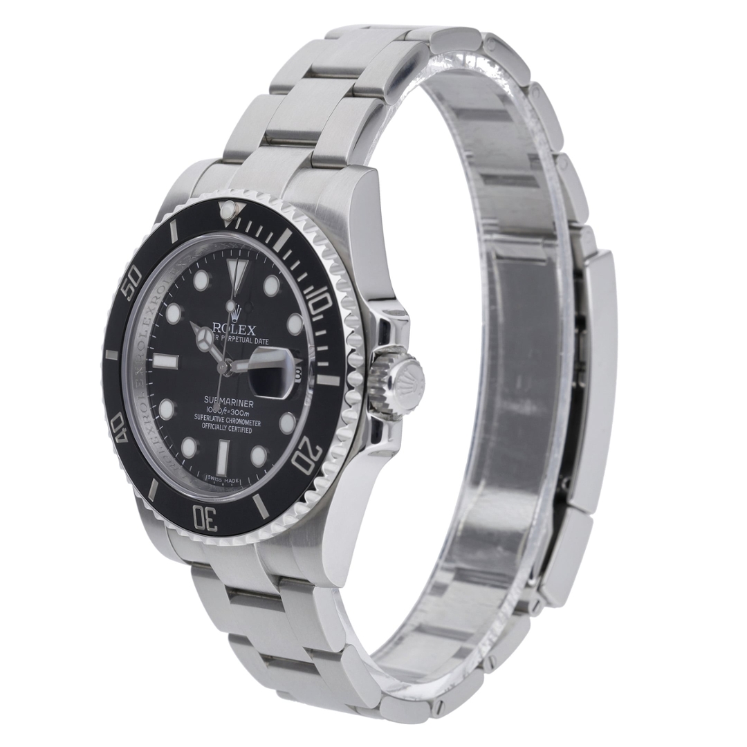 A Rolex Submariner Watch, model 116610LN, crafted in stainless steel with a black Cerachrom bezel and matching black dial. The 40mm Oyster case is paired with the classic Oyster bracelet, delivering the unmistakable proportions that defined the modern Submariner era. Bold luminous hour markers, Mercedes hands, and the date display at 3 o’clock with a Cyclops lens ensure maximum clarity. At the same time, the unidirectional ceramic bezel provides both durability and precise dive-timing functionality.