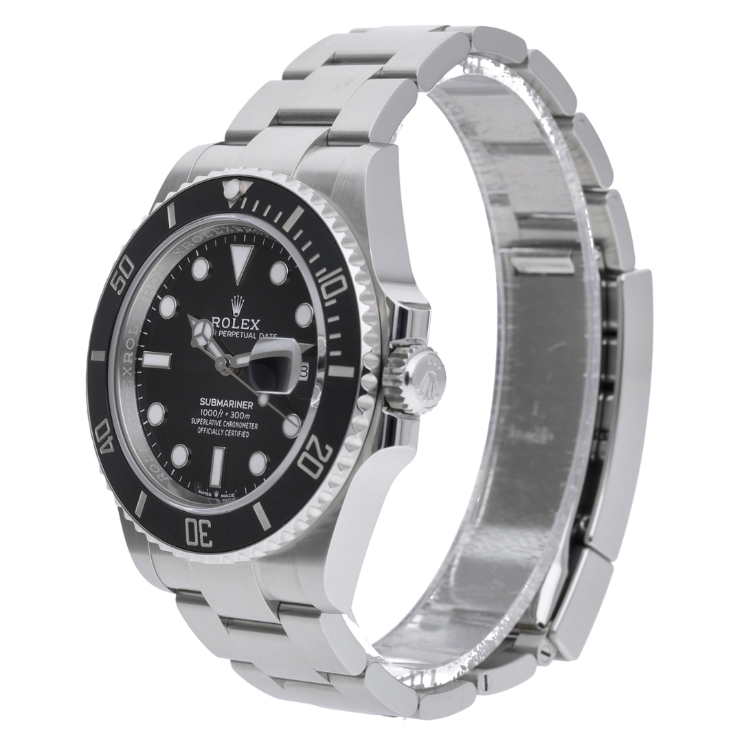 A Rolex Submariner 126610LN is presented in stainless steel with a black dial and a matching Cerachrom bezel, offering a clean, contemporary evolution of this iconic model. The 41mm Oyster case provides a slightly broader stance while retaining excellent balance on the wrist. Luminous hour markers, Mercedes hands and the Cyclops date window ensure strong legibility in all lighting conditions, while the unidirectional bezel adds practical functionality.