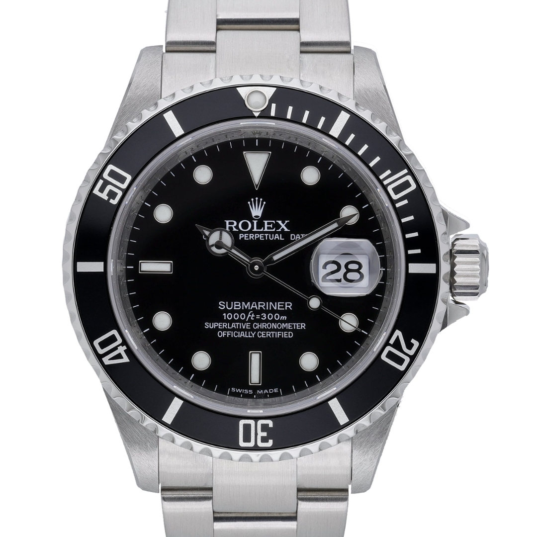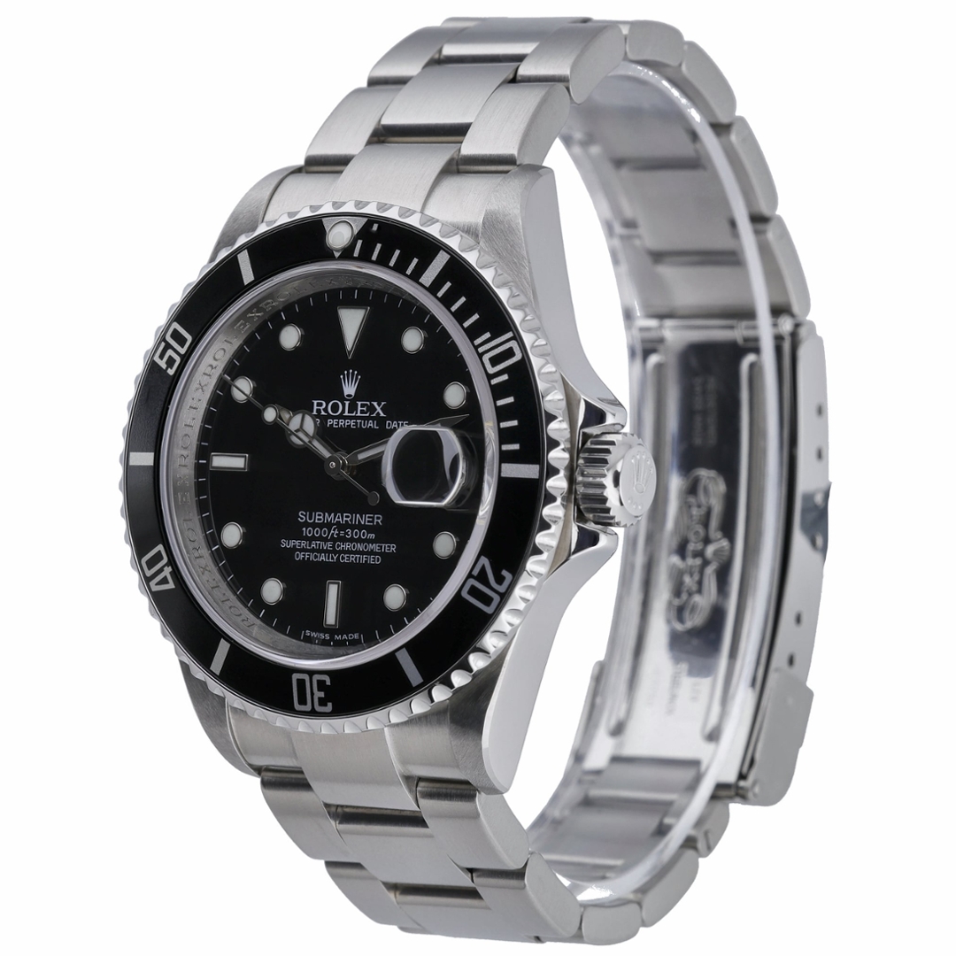 A Rolex Submariner 16610 is presented in stainless steel with a black dial and a matching unidirectional bezel, delivering the clean, purposeful design that defines this iconic model. The 40mm Oyster case offers balanced proportions, while luminous hour markers, Mercedes hands and the Cyclops date display ensure excellent legibility in all conditions. Its understated aesthetic makes it equally suited to daily wear and more active use.
