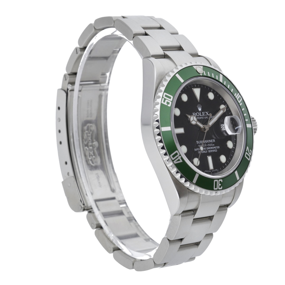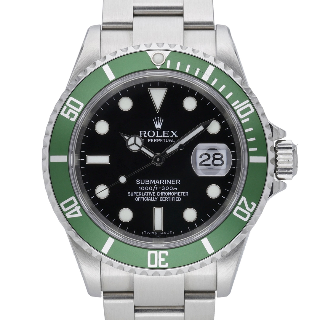 A Rolex Submariner reference 16610LV, affectionately known as the “Kermit,” presented in stainless steel with a 40mm Oyster case and the iconic green aluminium bezel. The classic black dial provides sharp contrast against the vibrant bezel, with luminous hour markers and Mercedes hands ensuring excellent legibility, making this one of the most recognisable and celebrated Submariner variations.