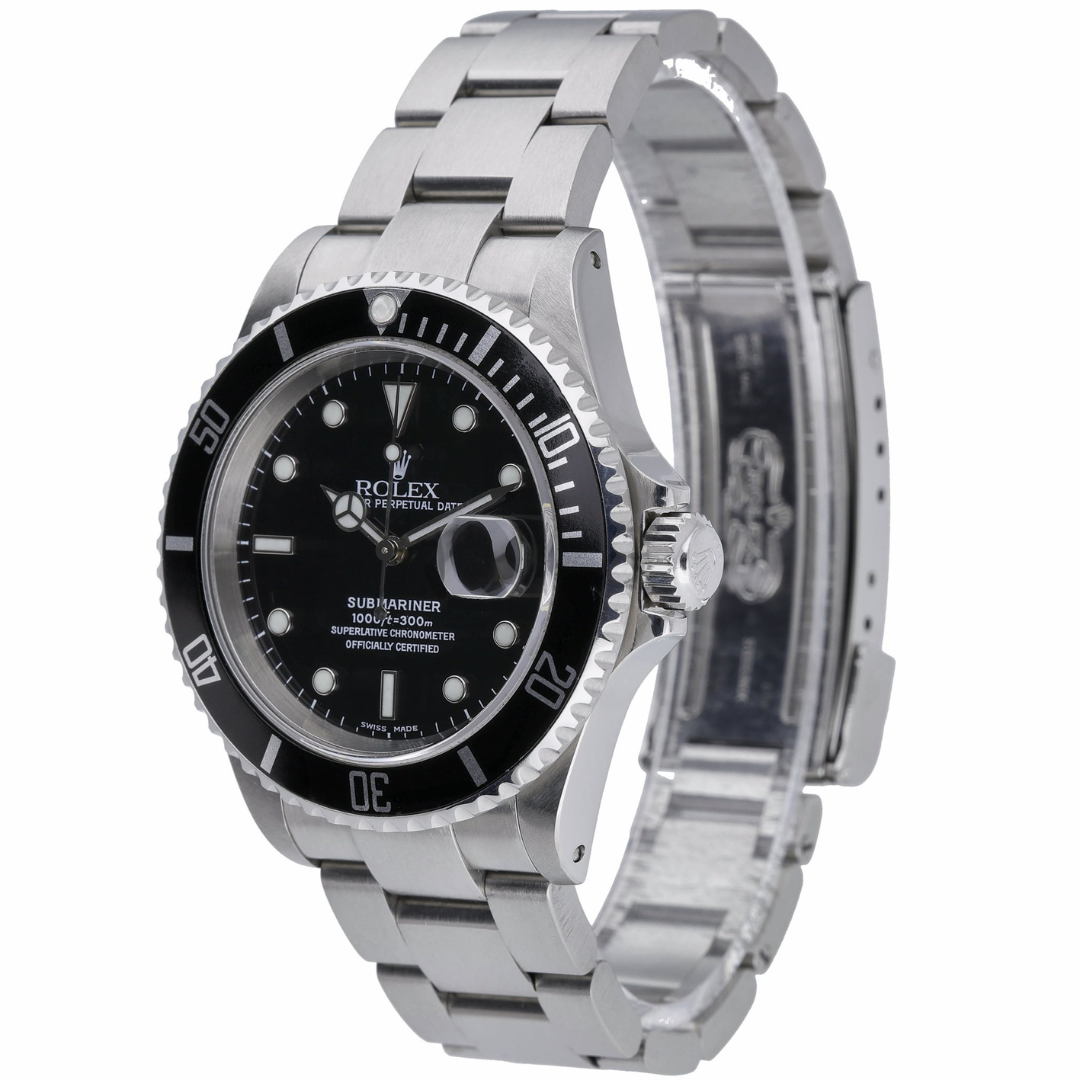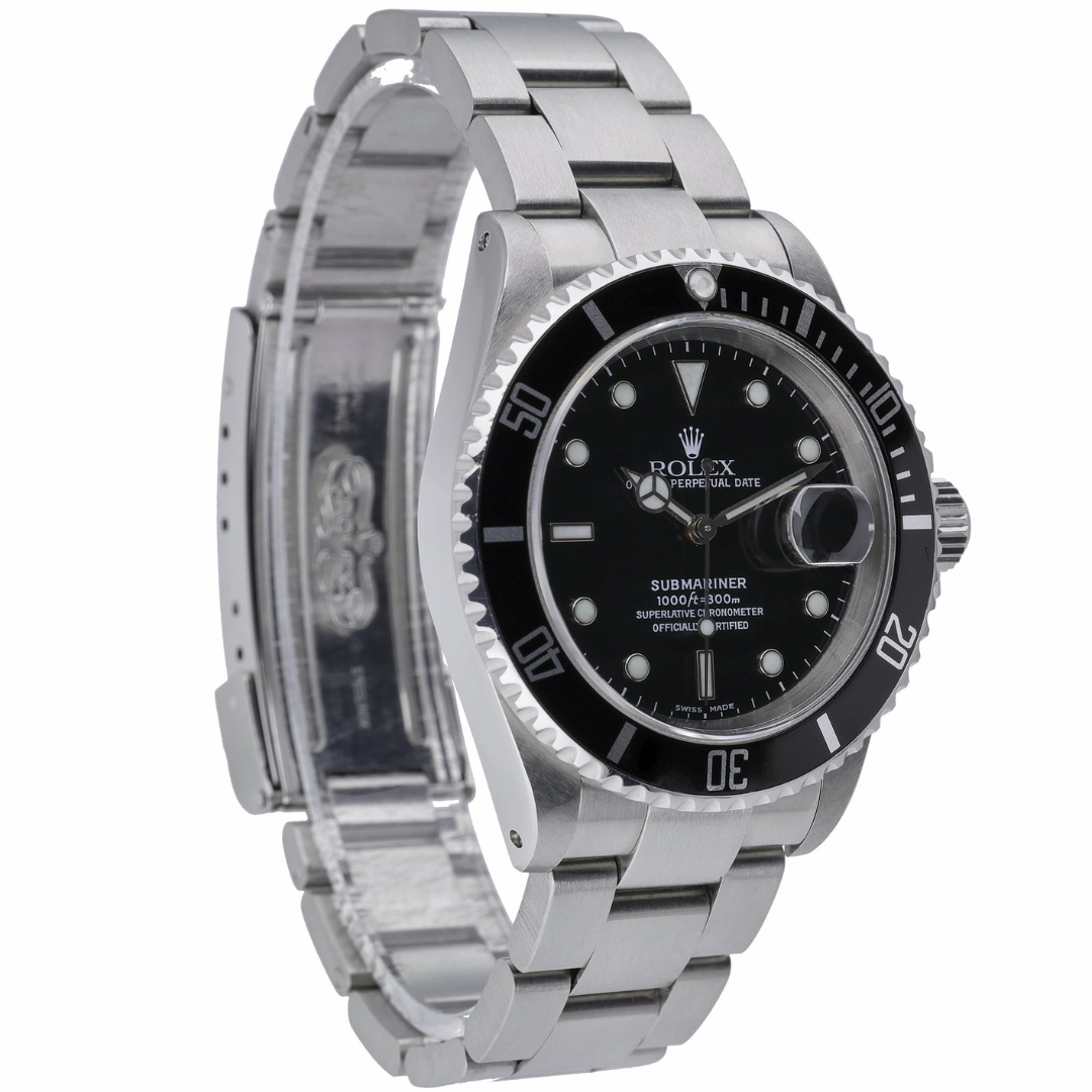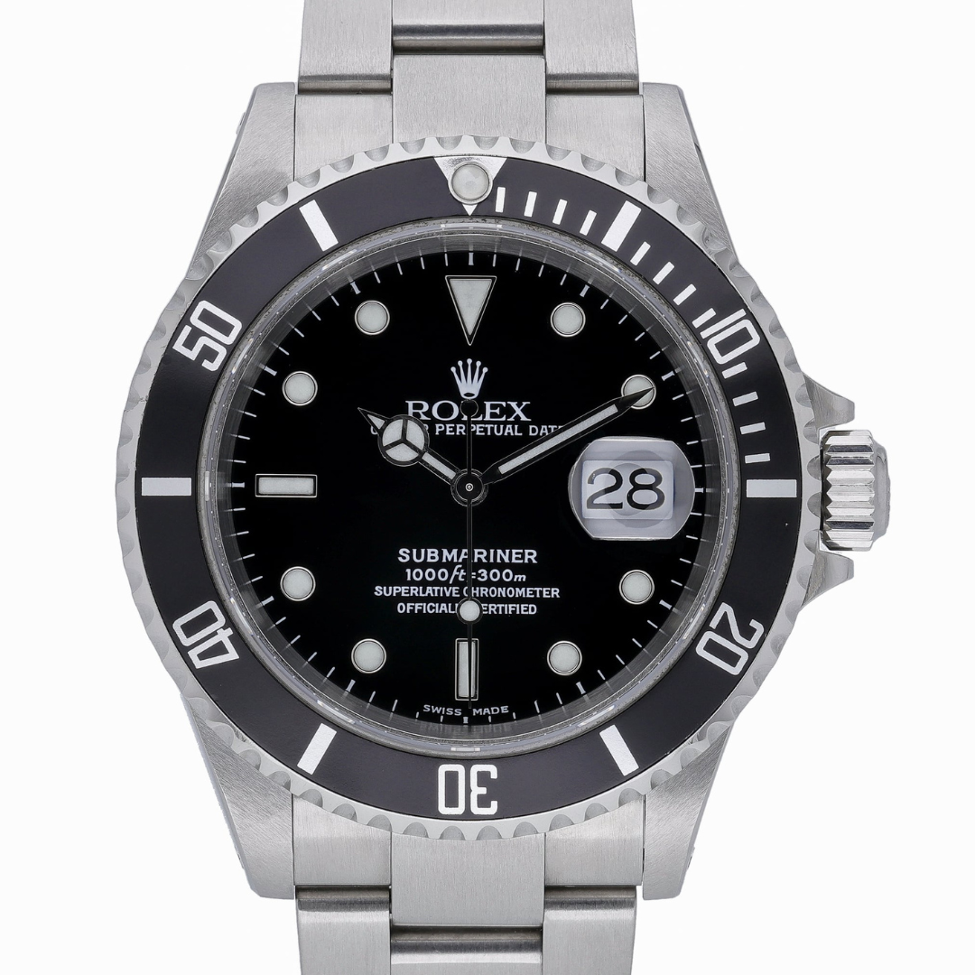 A Rolex Submariner Date 16610, crafted in stainless steel, represents one of the most iconic and enduring professional dive watches ever produced. The classic 40mm Oyster case is paired with the robust Oyster bracelet, delivering the unmistakable silhouette that has defined the Submariner for generations. A black unidirectional dive bezel frames the timeless black dial, where luminous hour markers and Mercedes hands provide exceptional legibility, with a date display at 3 o’clock.
