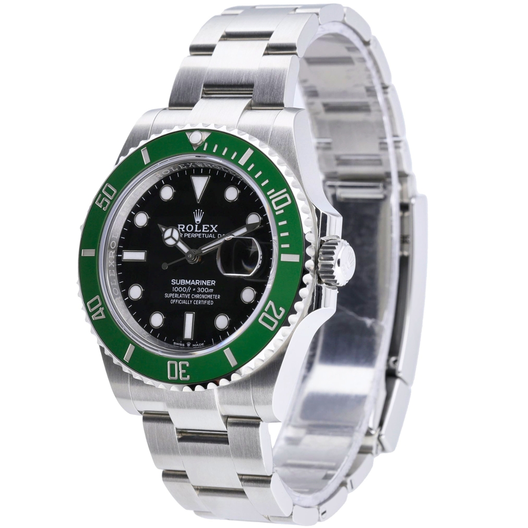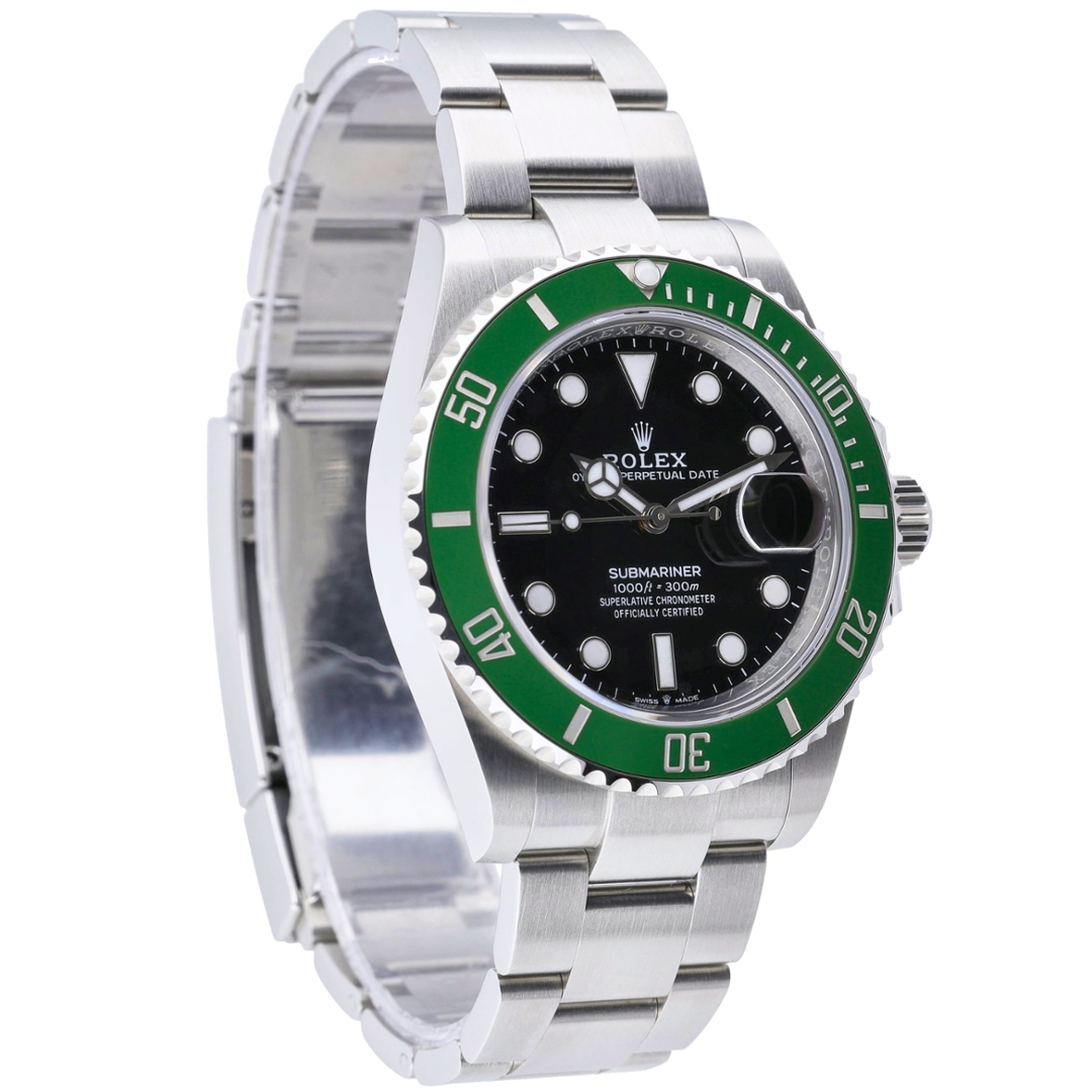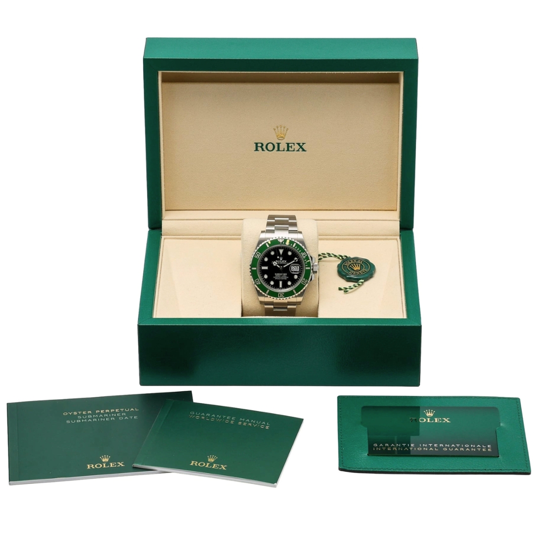 A Rolex Submariner Watch, Stainless Steel with a Green Bezel and Black Dial.