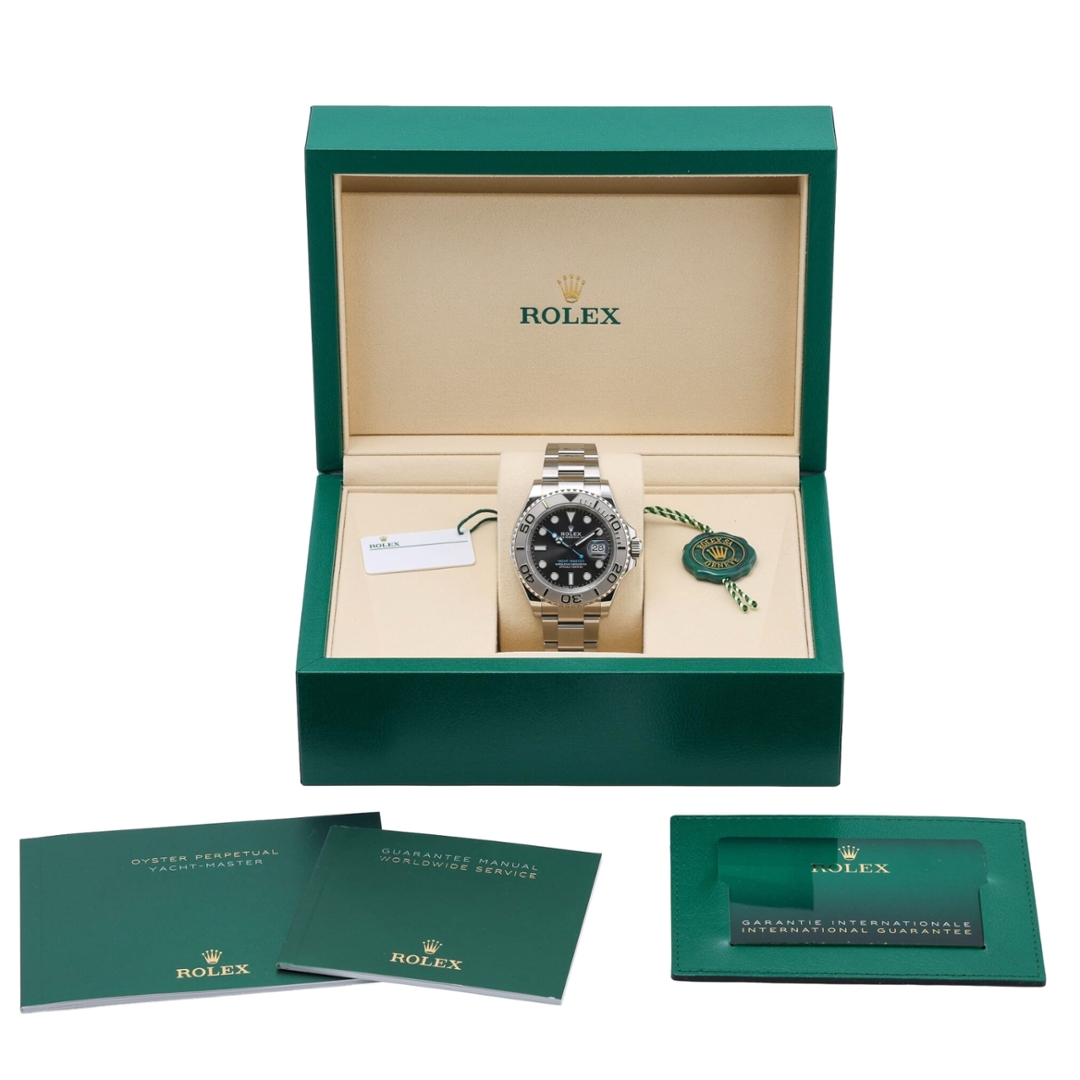 A Rolex Yacht-Master 40, reference 126622, blends refined sportiness with precious-metal detailing, making it one of the most versatile and elegant models in Rolex’s professional range. This 2025 edition features a 40mm Oystersteel case paired with a solid platinum bidirectional bezel, delivering a subtle contrast and understated luxury. The slate grey dial with bold Chromalight hour markers ensures excellent legibility in all conditions.