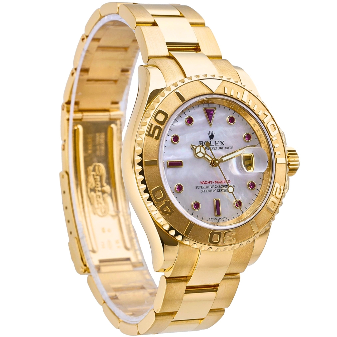 A Rolex Yacht-Master 40 Watch in full 18ct yellow gold, presented in immaculate condition, offering a striking and luxurious take on this iconic nautical model. The 40mm case is paired with a matching Oyster bracelet, giving the watch a strong yet refined presence on the wrist. The white mother-of-pearl dial is elevated by vibrant ruby-set hour markers, delivering a rich contrast against the gold case while maintaining excellent legibility and a distinctive aesthetic.
