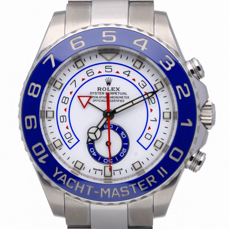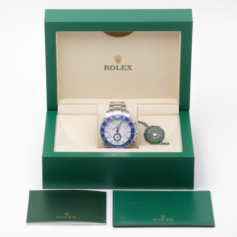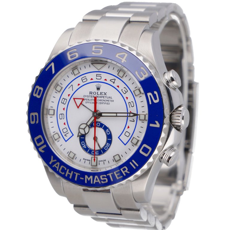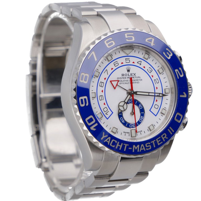 A Rolex Yacht-Master II, reference 116680, constructed in stainless steel with a striking blue Cerachrom bezel and crisp white dial — a technically advanced and visually commanding regatta chronograph designed for professional sailing, yet unmistakably Rolex in both form and function. With its 44mm case, this model stands as one of the largest in the brand’s lineup, offering strong wrist presence and advanced mechanical performance.