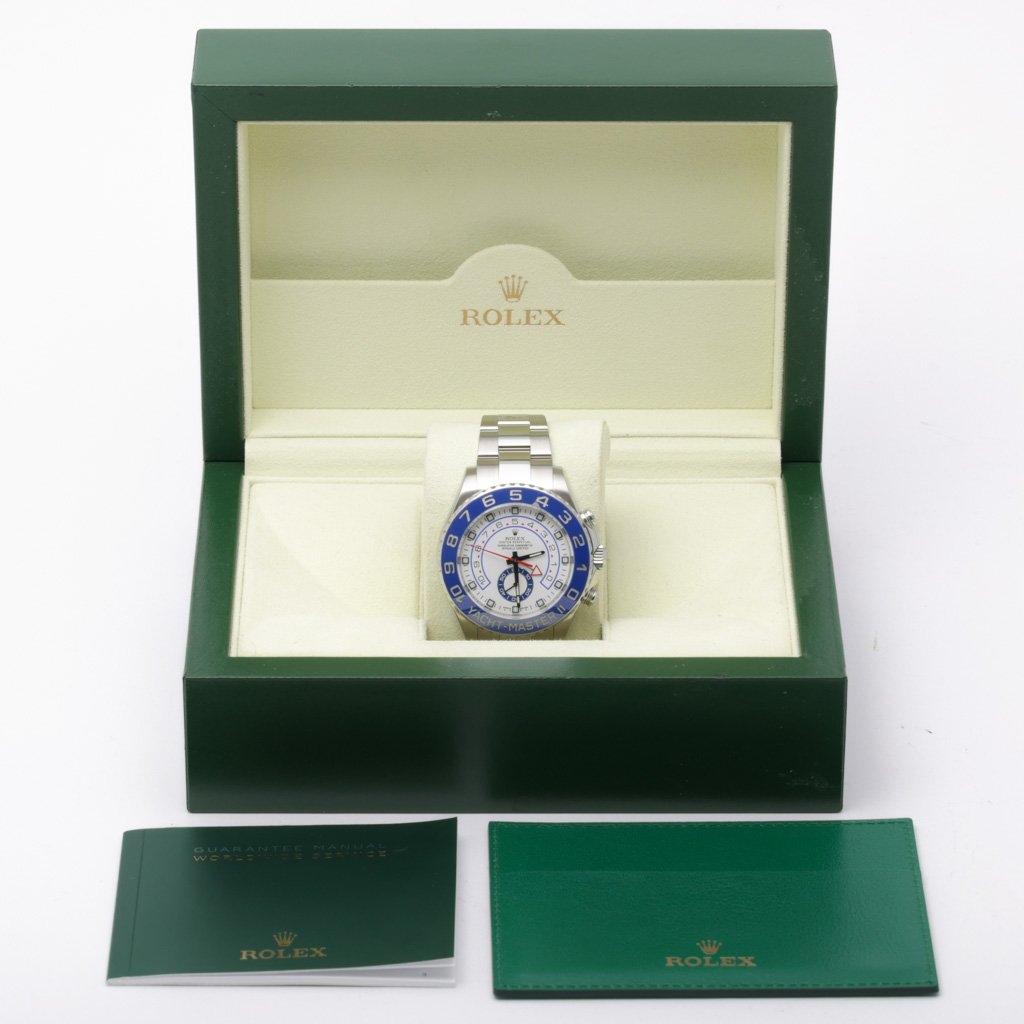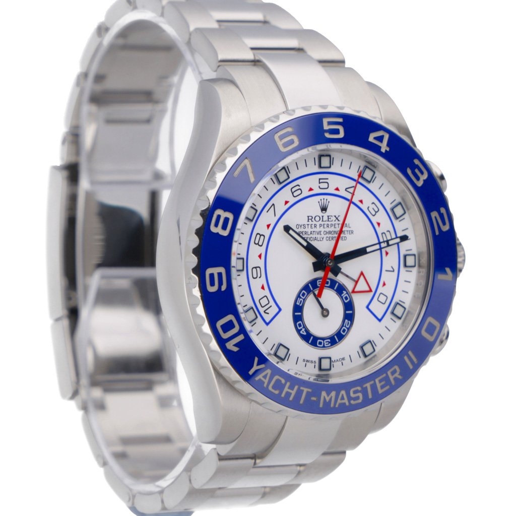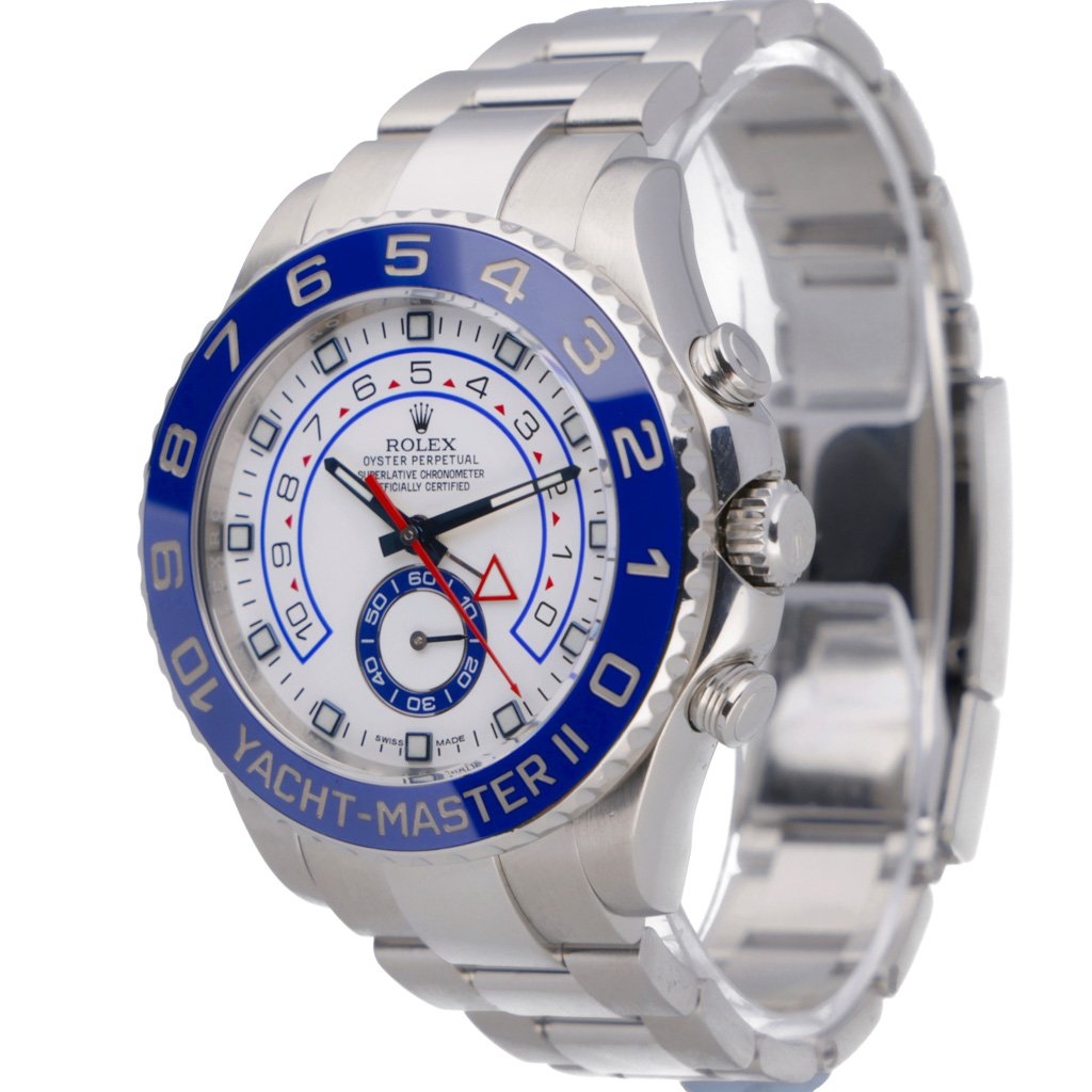 A Rolex Yacht-Master II Watch in Stainless Steel, presented with a striking blue Cerachrom bezel and crisp white dial. This reference 116680, released in 2014, is the ultimate professional regatta chronograph, embodying both technical mastery and bold design.