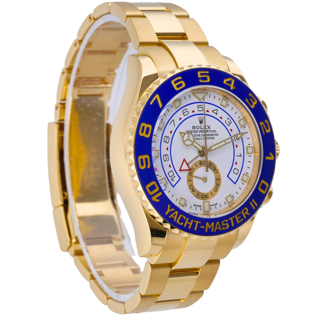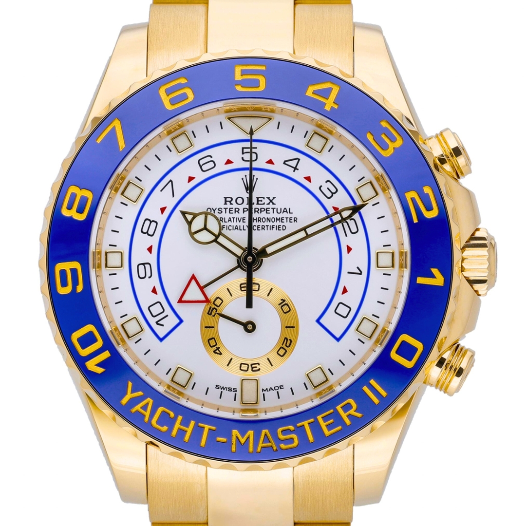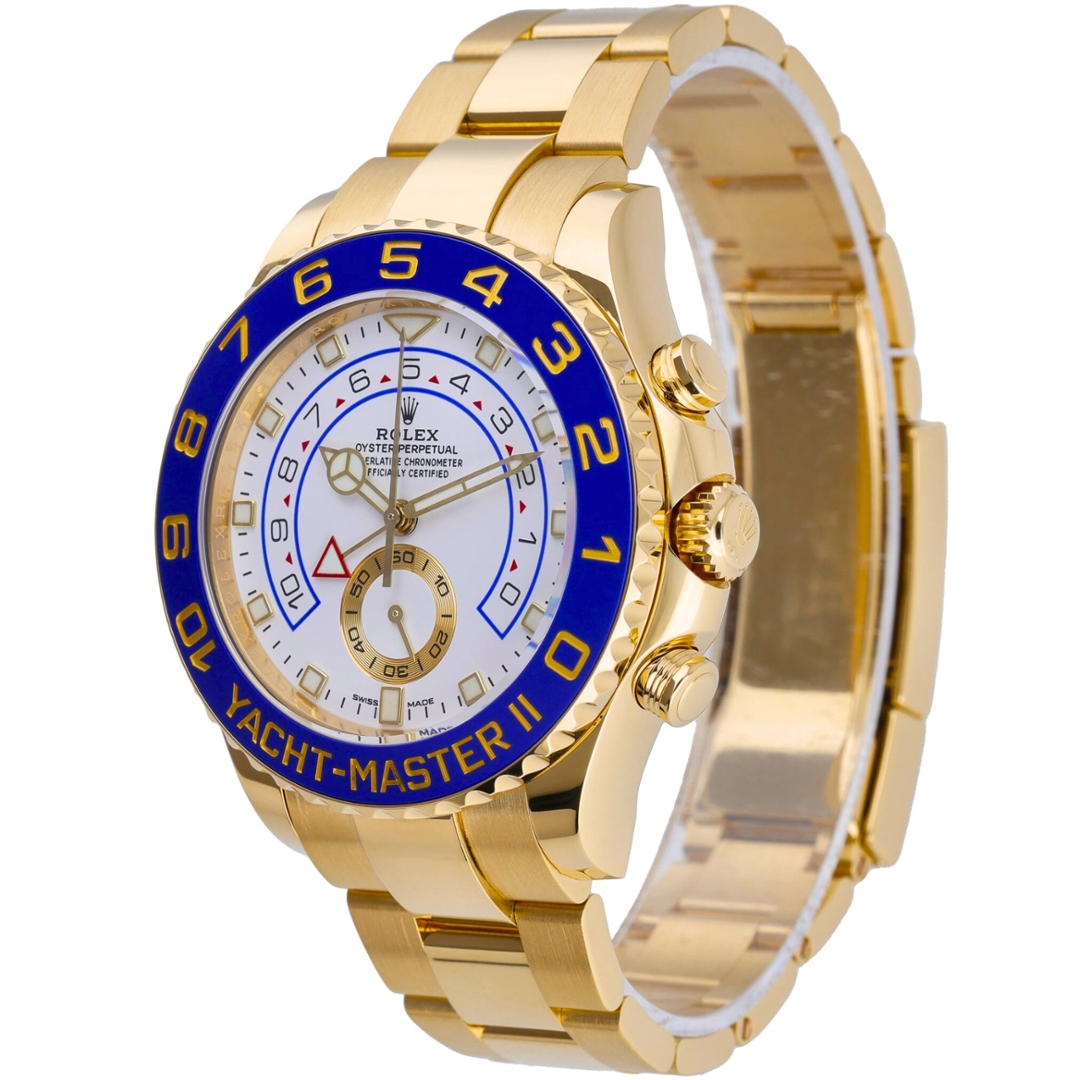 A Rolex Yacht-Master II Watch presented in full 18ct yellow gold, featuring the striking blue Cerachrom bezel and crisp white regatta dial that defines this prestigious sailing chronograph. The substantial 44mm Oyster case delivers strong wrist presence while maintaining the refined finishing and robust construction expected from Rolex’s professional range. Bold gold numerals on the blue bezel frame the dial beautifully, while luminous hour markers and distinctive hands ensure excellent legibility in all conditions.