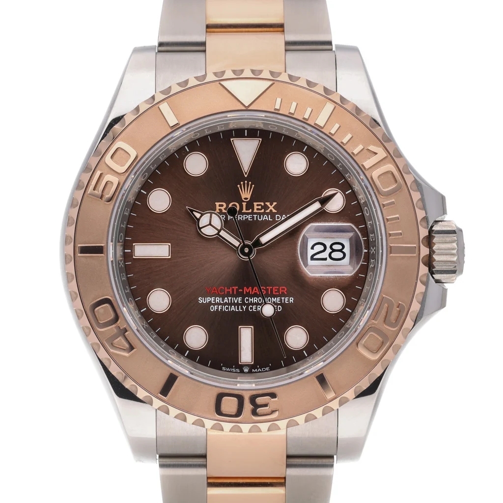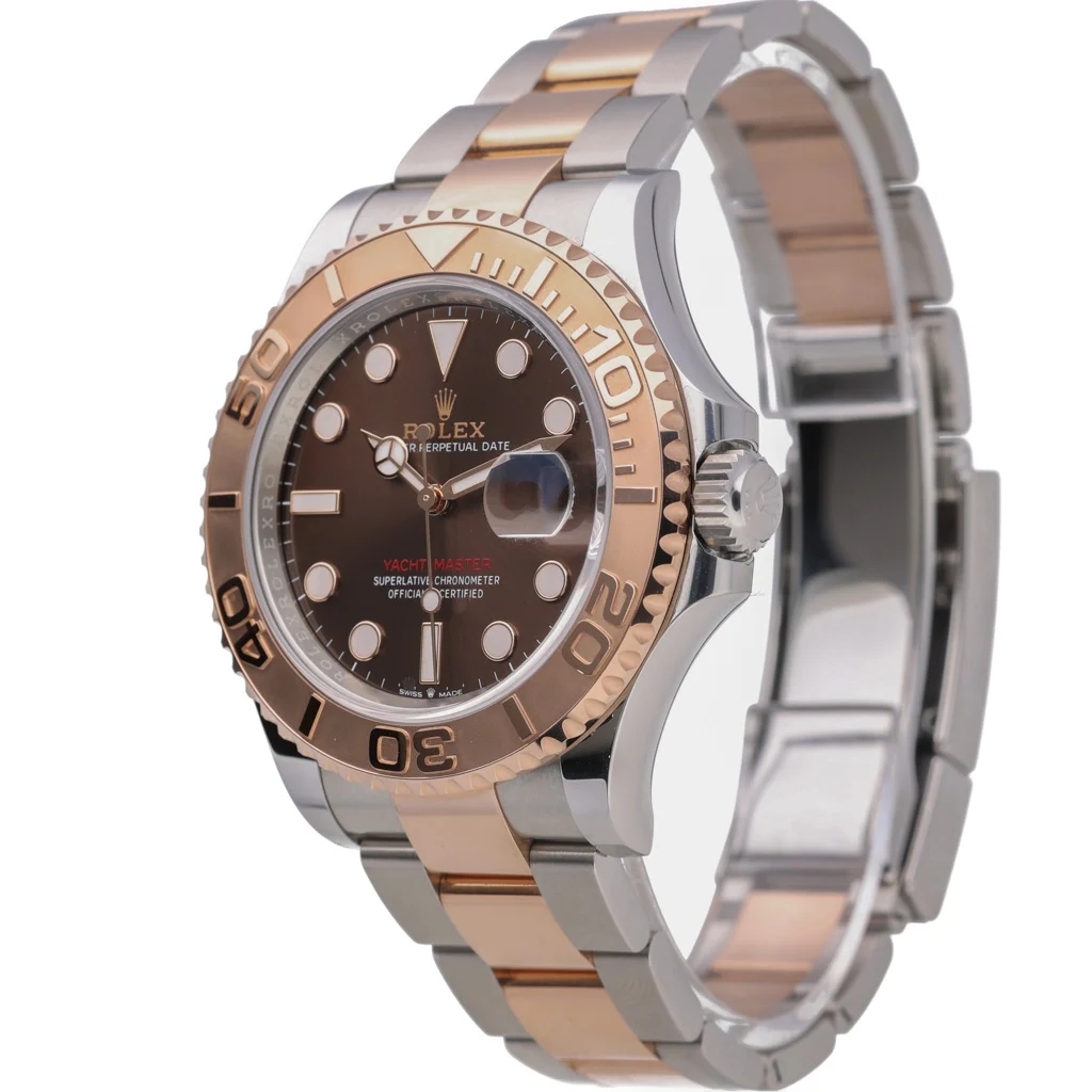 A bi-metal Rolex Yacht-Master reference 126621 is a refined modern sports watch that blends luxury materials with understated versatility. Crafted from stainless steel and 18ct rose gold, the 40mm Oyster case is paired with a solid rose gold bezel and a rich chocolate dial, creating a warm, contemporary aesthetic. Produced in 2024, this example is presented in immaculate condition.