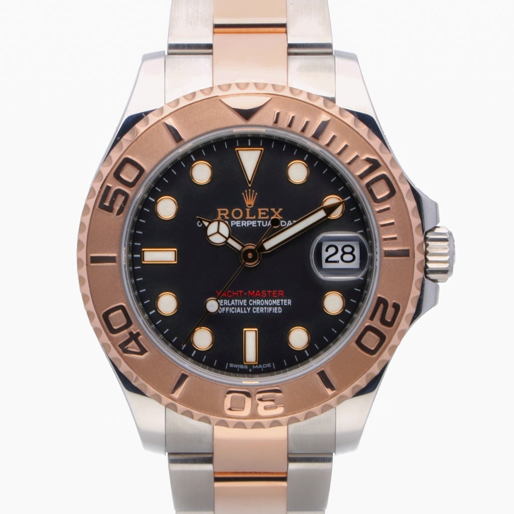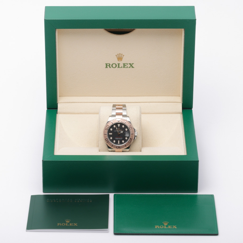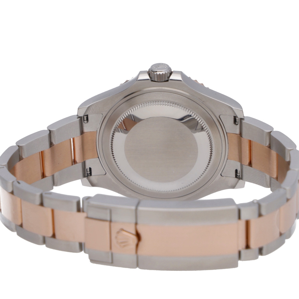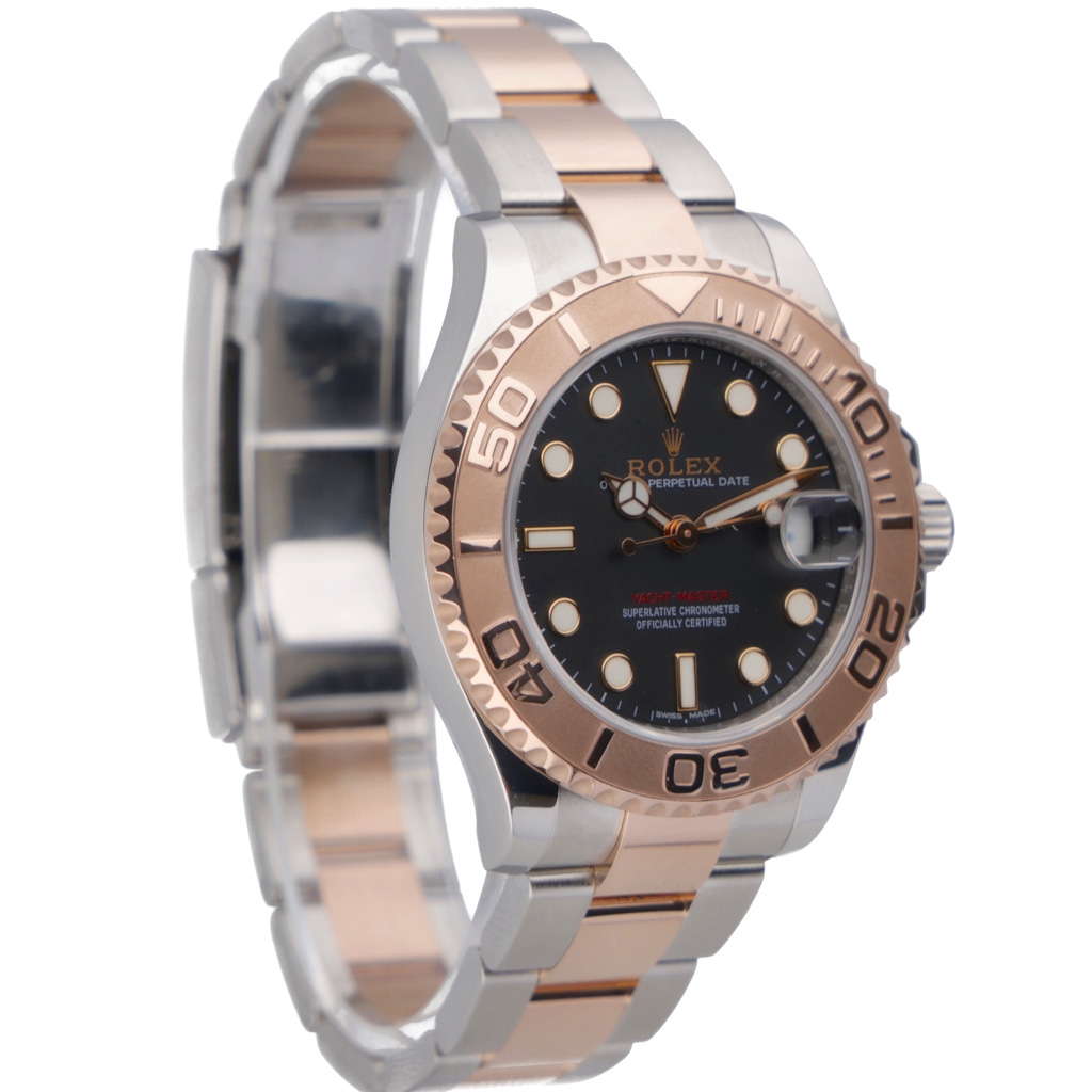 A bi-metal Rolex Yacht-Master reference 268621 pairs stainless steel with 18ct rose gold, complemented by the distinctive charcoal dial that defines this elegant sports model. The 37mm Oyster case is fitted with a rose gold bidirectional rotatable bezel featuring raised numerals, while luminous hour markers ensure excellent legibility in all conditions.