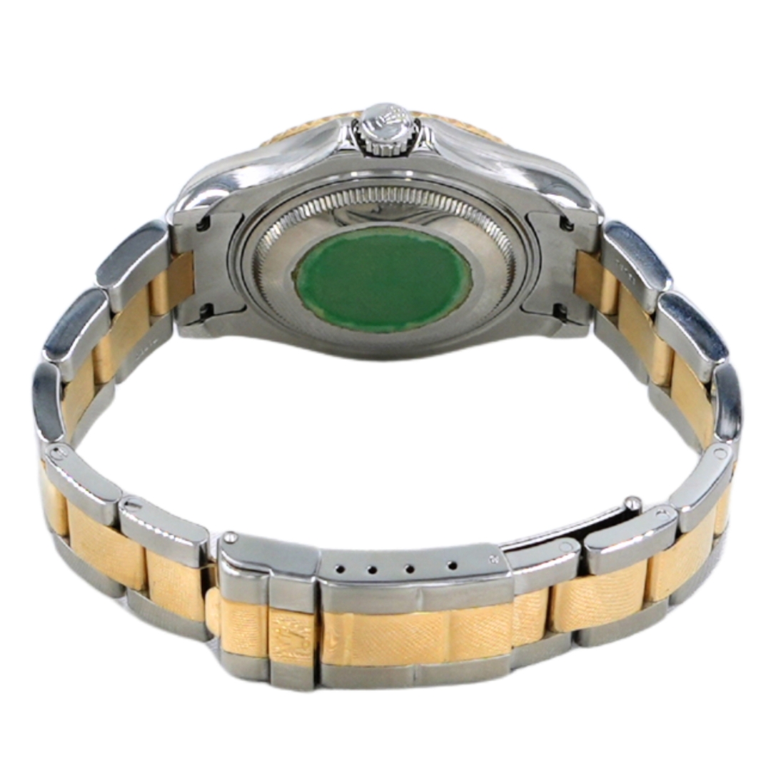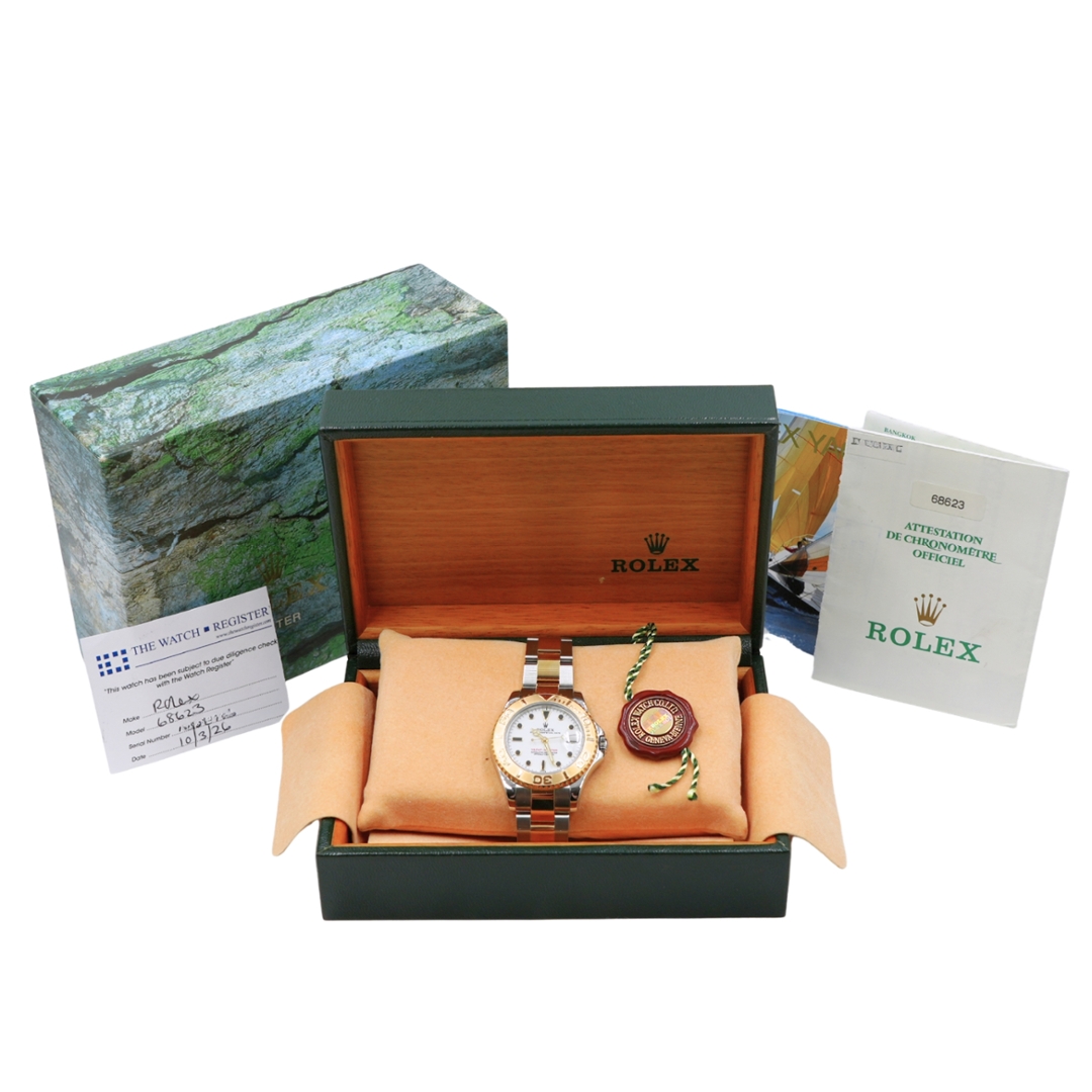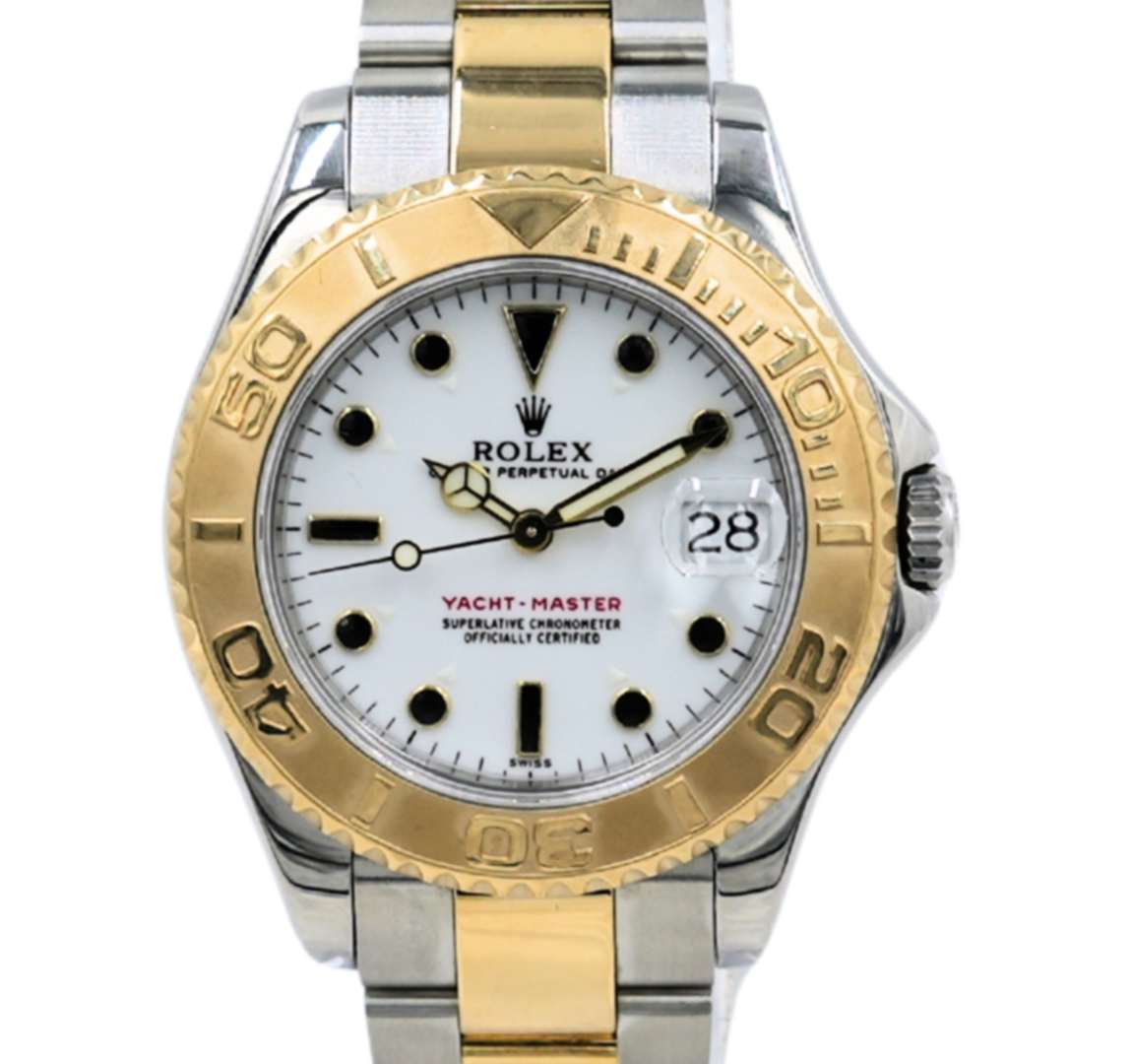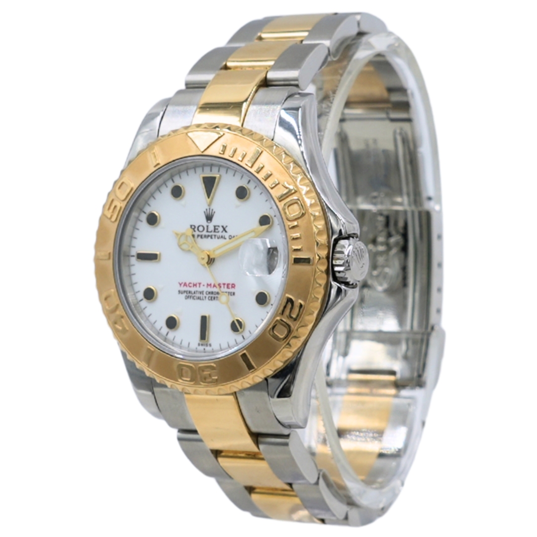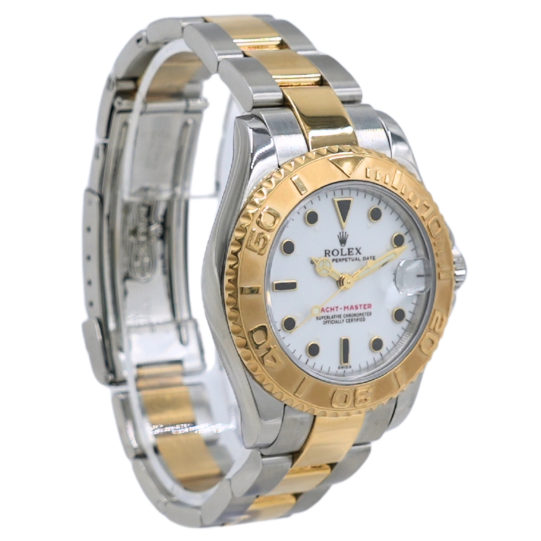 A Rolex Yacht-Master reference 168623 in stainless steel and 18ct yellow gold, featuring a 35mm case and a solid 18ct yellow gold bidirectional bezel with raised numerals. The crisp white dial delivers a clean, highly legible display, offering strong contrast against the warm gold accents, while the classic Oyster construction ensures both durability and everyday versatility.