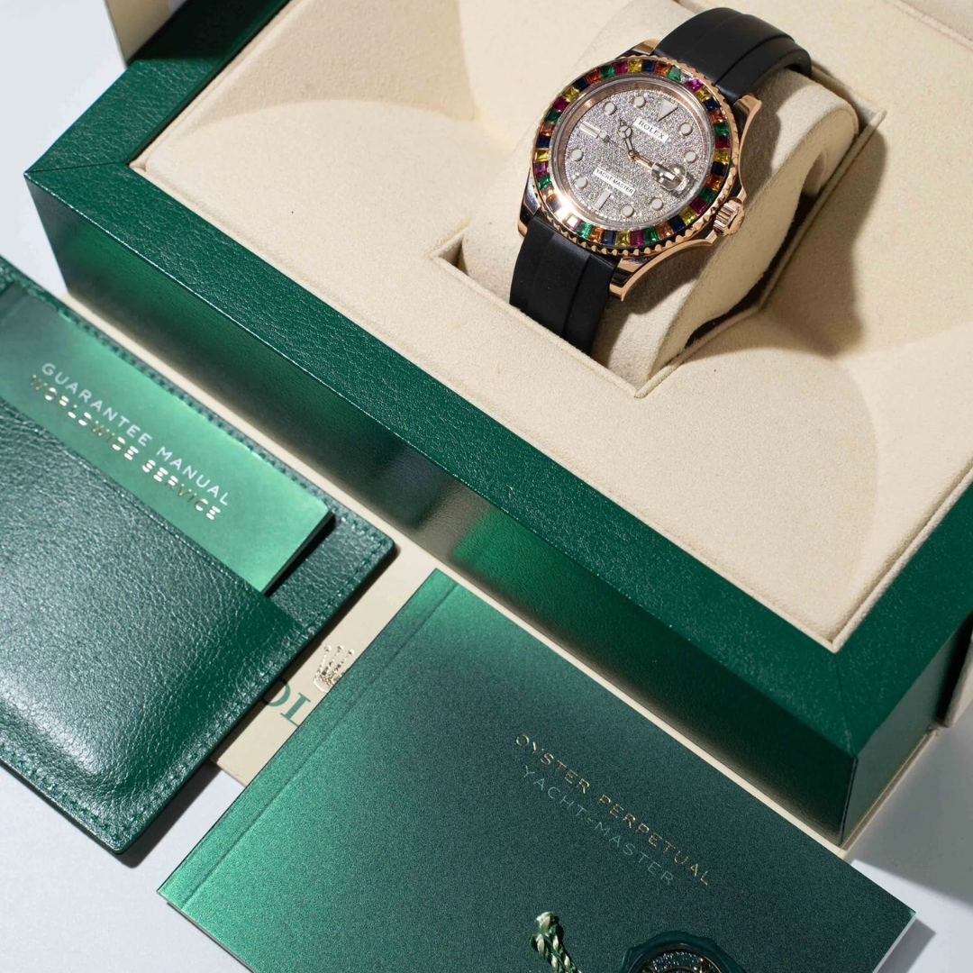Powered by the Rolex calibre 3135 automatic movement, known for its proven reliability, precision, and robustness. The Yacht-Master line blends sporty capability with luxurious materials, and this piece pushes that identity further with its unique, heavily customised presentation.