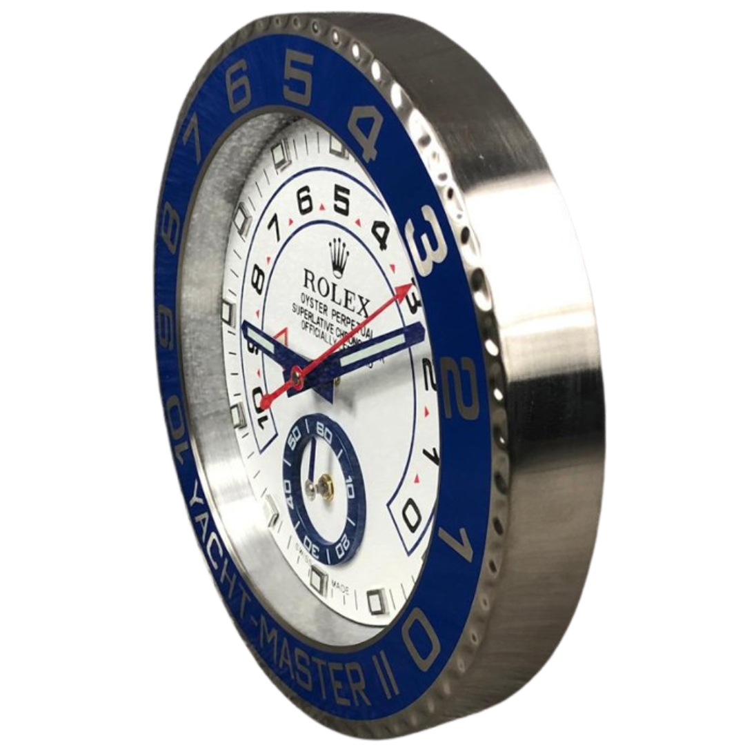 Bring a bold nautical flair to your space with this striking stainless steel replica Rolex Yacht-Master II wall clock. Inspired by the iconic regatta chronograph, this timepiece features a crisp white face framed by a vibrant blue bezel, instantly commanding attention with its sporty elegance. At approximately 14 inches in height and width, it makes an impressive statement on any wall, whether in an office, showroom, or collector's den.
