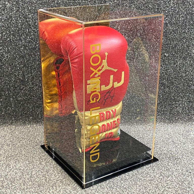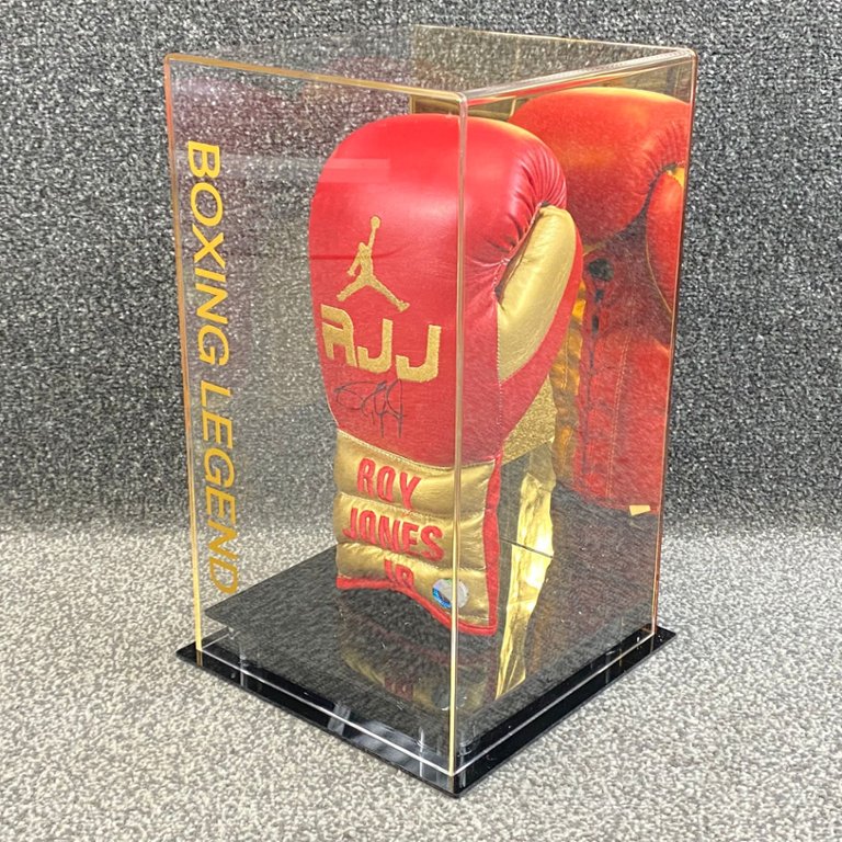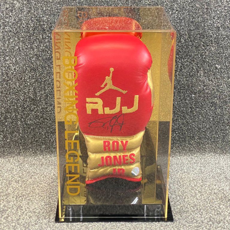 A signed & authenticated Roy Jones Jr Red & Gold Boxing Glove in a presentation case. Approx 15" height, 9" width.