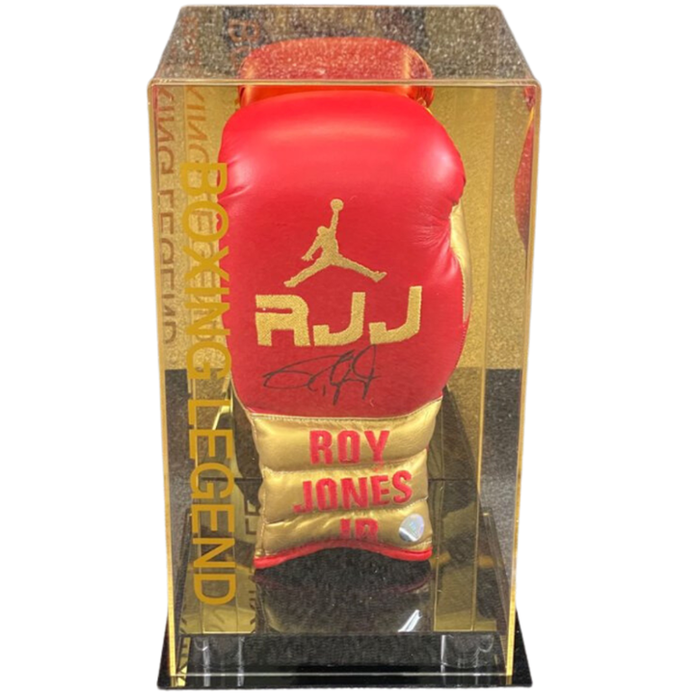 The presentation case provides a stylish and protective display for the signed boxing glove, ensuring its preservation for years to come. Whether featured in a personal sports memorabilia collection, a dedicated boxing-themed room, or a professional sports establishment, this authenticated Roy Jones Jr boxing glove is certain to captivate enthusiasts and admirers alike.