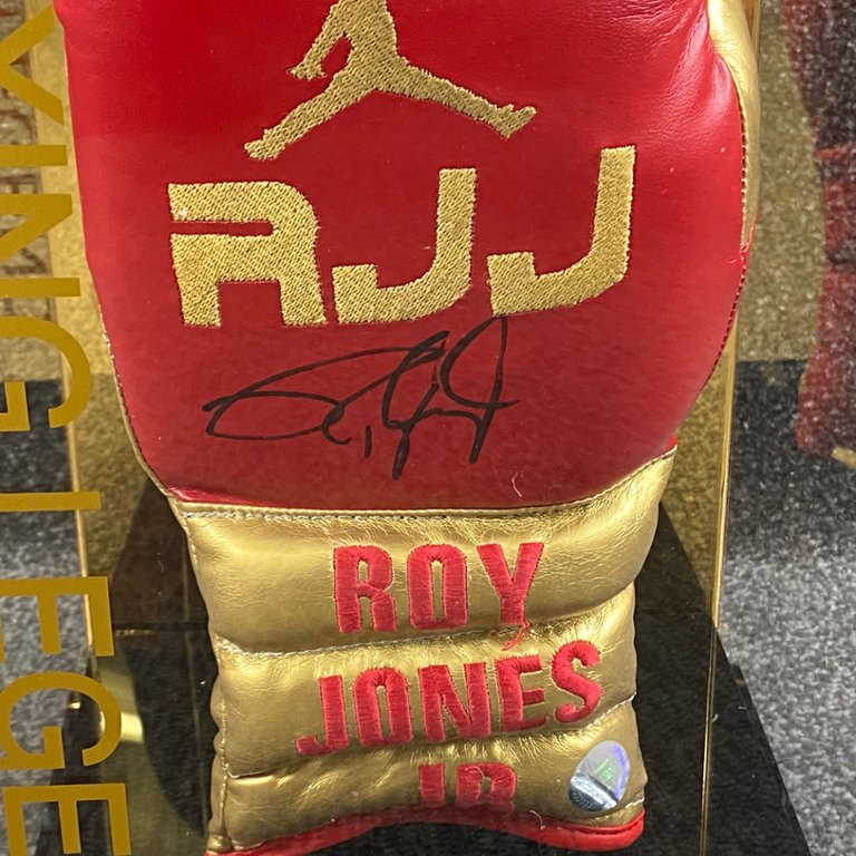 - > Roy Jones Jr Signed Red & Gold Boxing Glove
