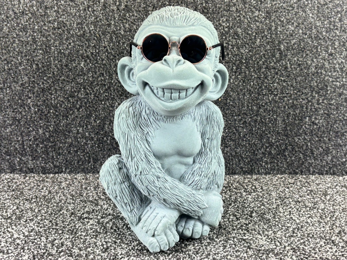 A grey sculpture of a chimp with shades that captures charm, humour, and modern style in one piece. This detailed sculpture features a seated chimpanzee with a wide, toothy grin, brought to life with textured fur and realistic features. What makes this piece stand out is the addition of sleek round sunglasses, giving the chimp a cool, contemporary edge that makes it perfect for quirky interiors.