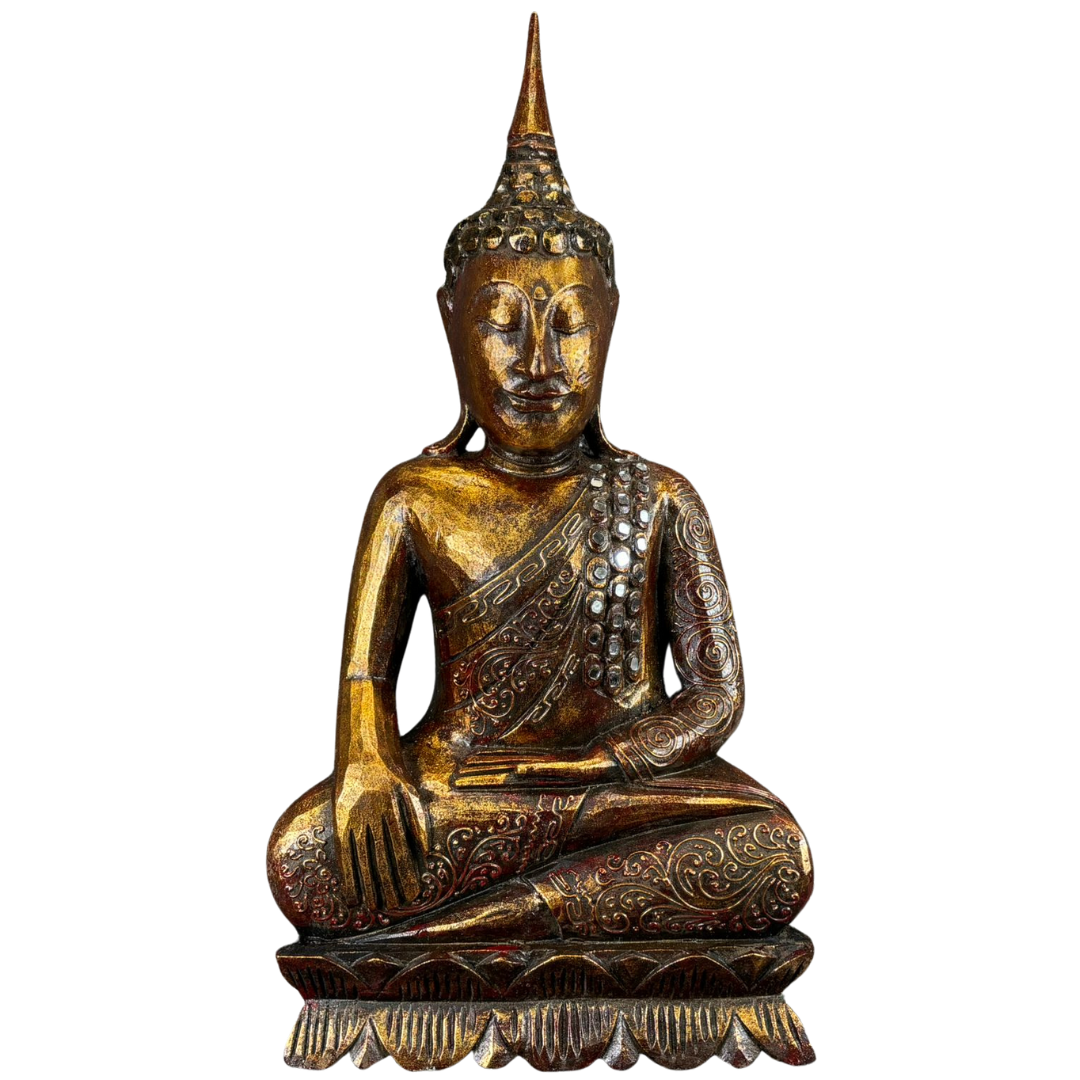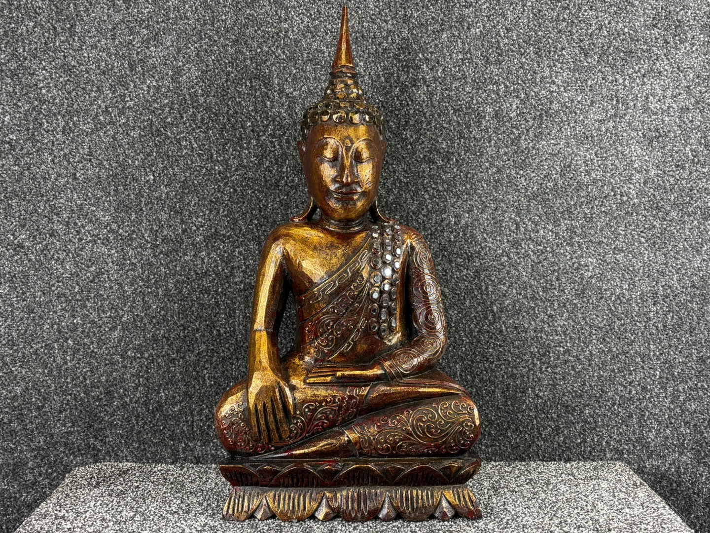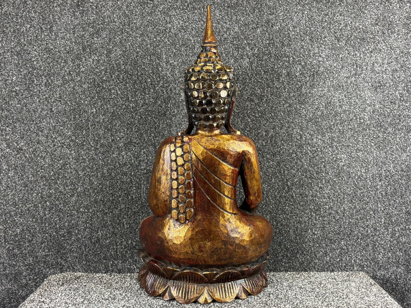 A sculpture of a Gold Sitting Buddha, exquisitely crafted to symbolise peace, enlightenment, and spiritual reflection. Measuring approximately 61cm in height, 31cm in width, and 15cm in depth, this magnificent piece commands attention with its timeless beauty and serene presence.
