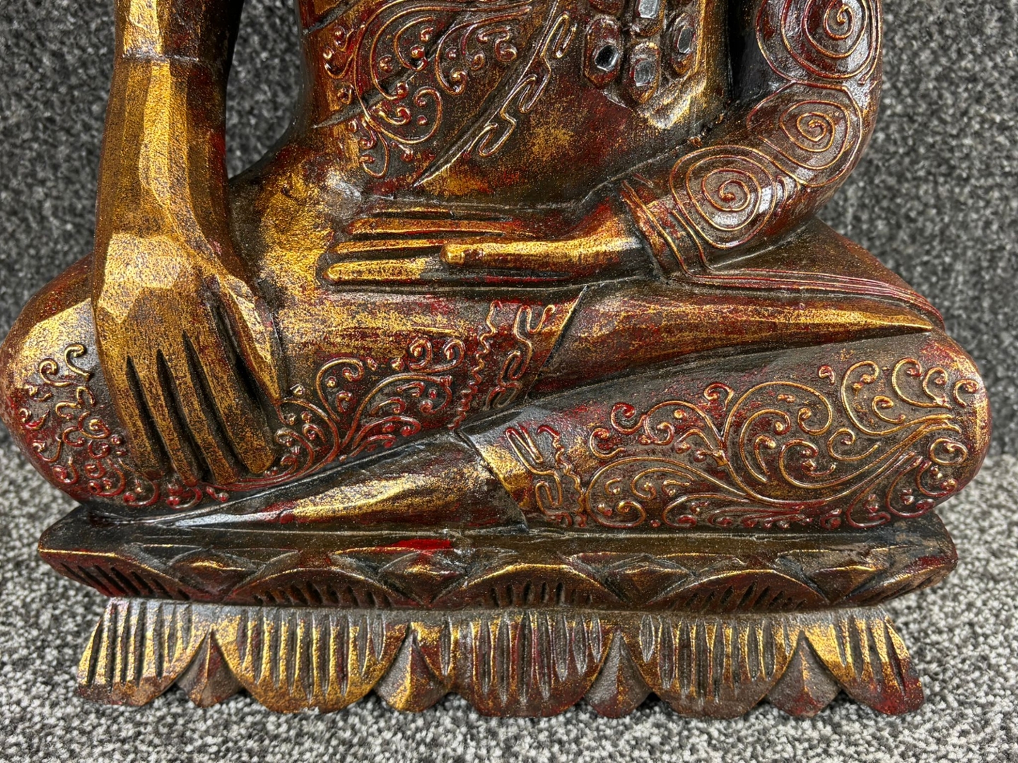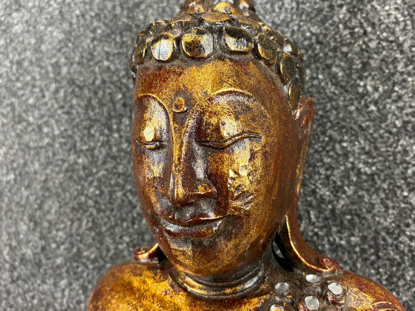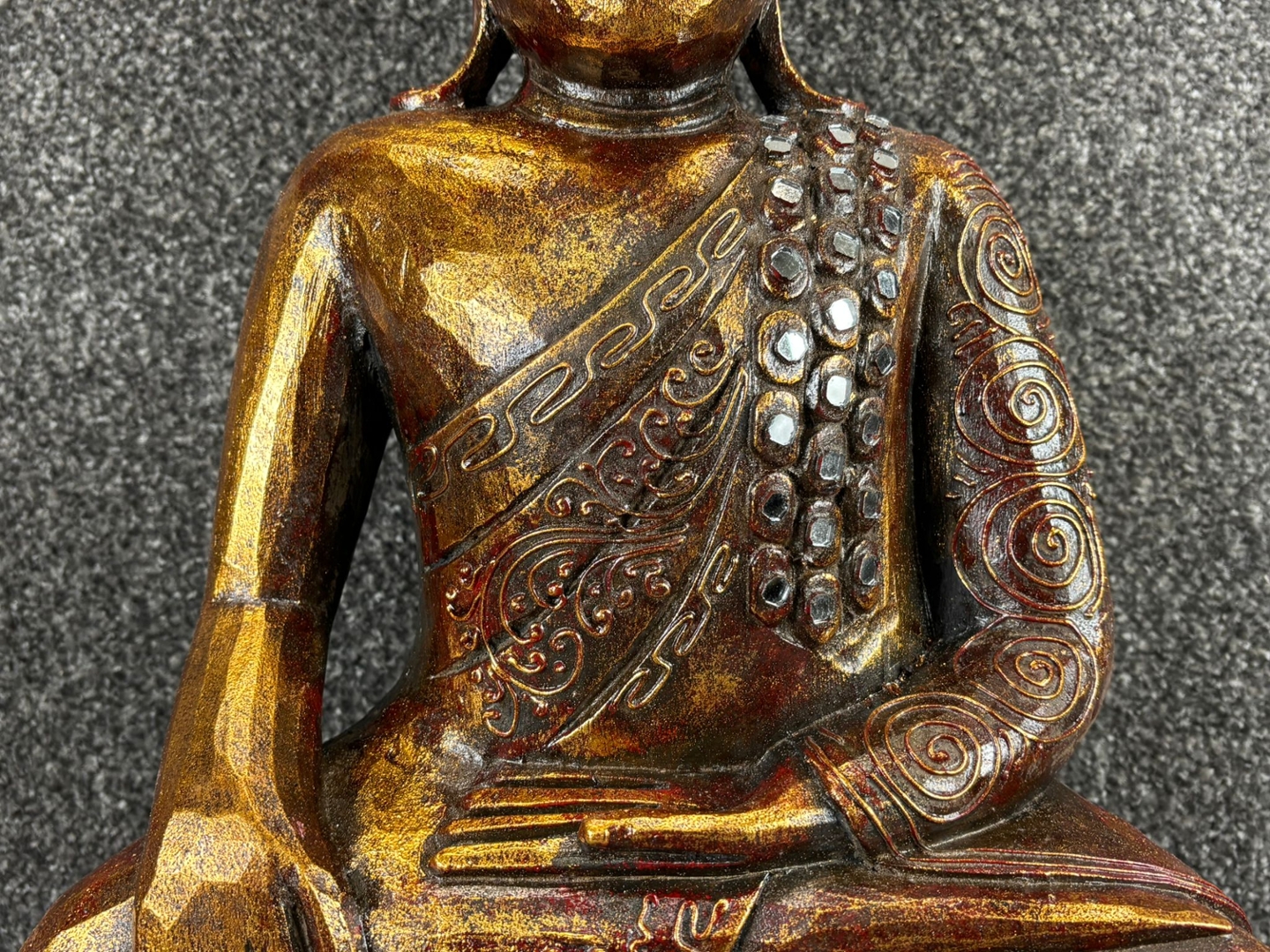 The Buddha is portrayed in a classic meditative pose, representing calmness and balance. The lustrous gold finish enhances the intricate detailing of the robe and facial features, while subtle bronze and red undertones add warmth and depth. Decorative embellishments further highlight the craftsmanship, creating a refined and radiant appearance.