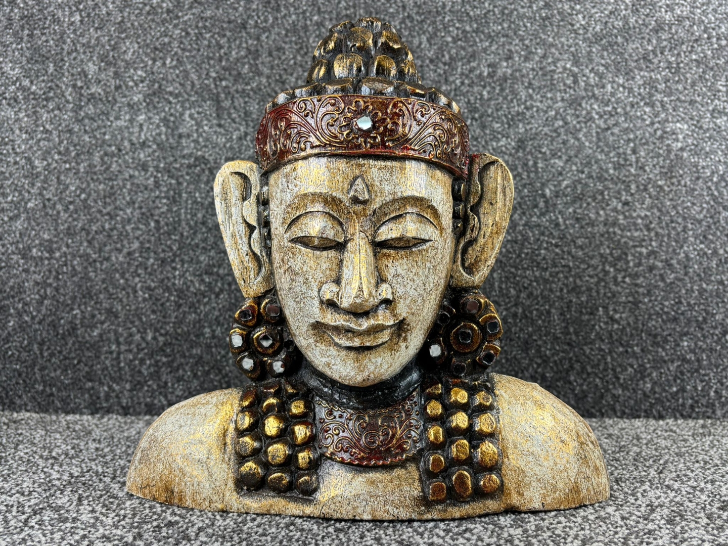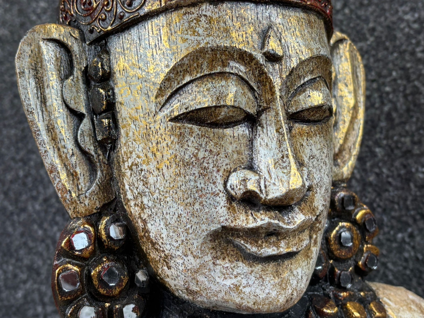 The sculpture features intricate detailing throughout, from the textured curls of the hair to the finely carved facial features that exude calm and contemplation. Accented with subtle gold and bronze tones, the design highlights the Buddha’s peaceful expression and ornate headpiece, creating a sense of timeless elegance and spiritual depth.