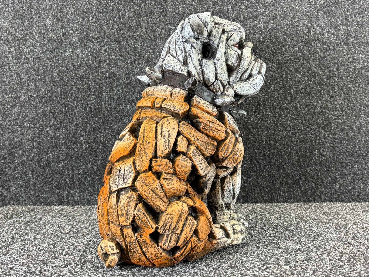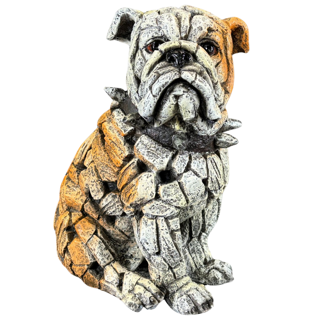 A sculpture of a sitting bulldog that captures the bold and loyal character of this iconic breed. Crafted with impressive texture and detail, the piece features the bulldog’s distinctive wrinkled face, muscular frame, and proud stance. The surface is finished in natural tones of grey, black, and warm tan, giving the sculpture a rugged, stone-like appearance that enhances its lifelike presence.