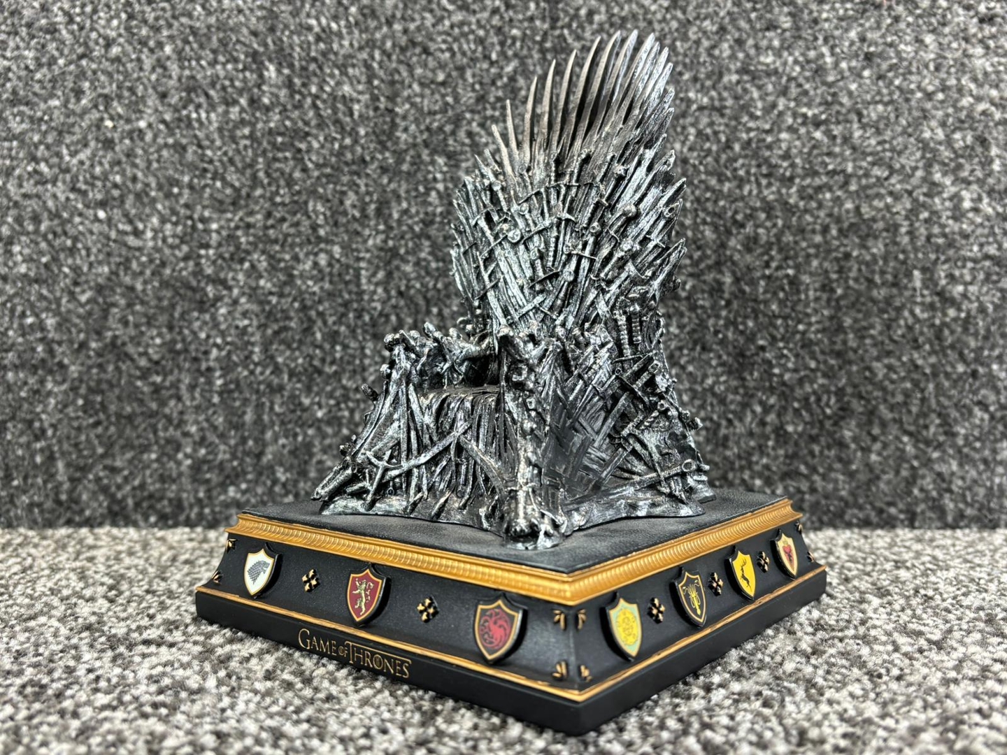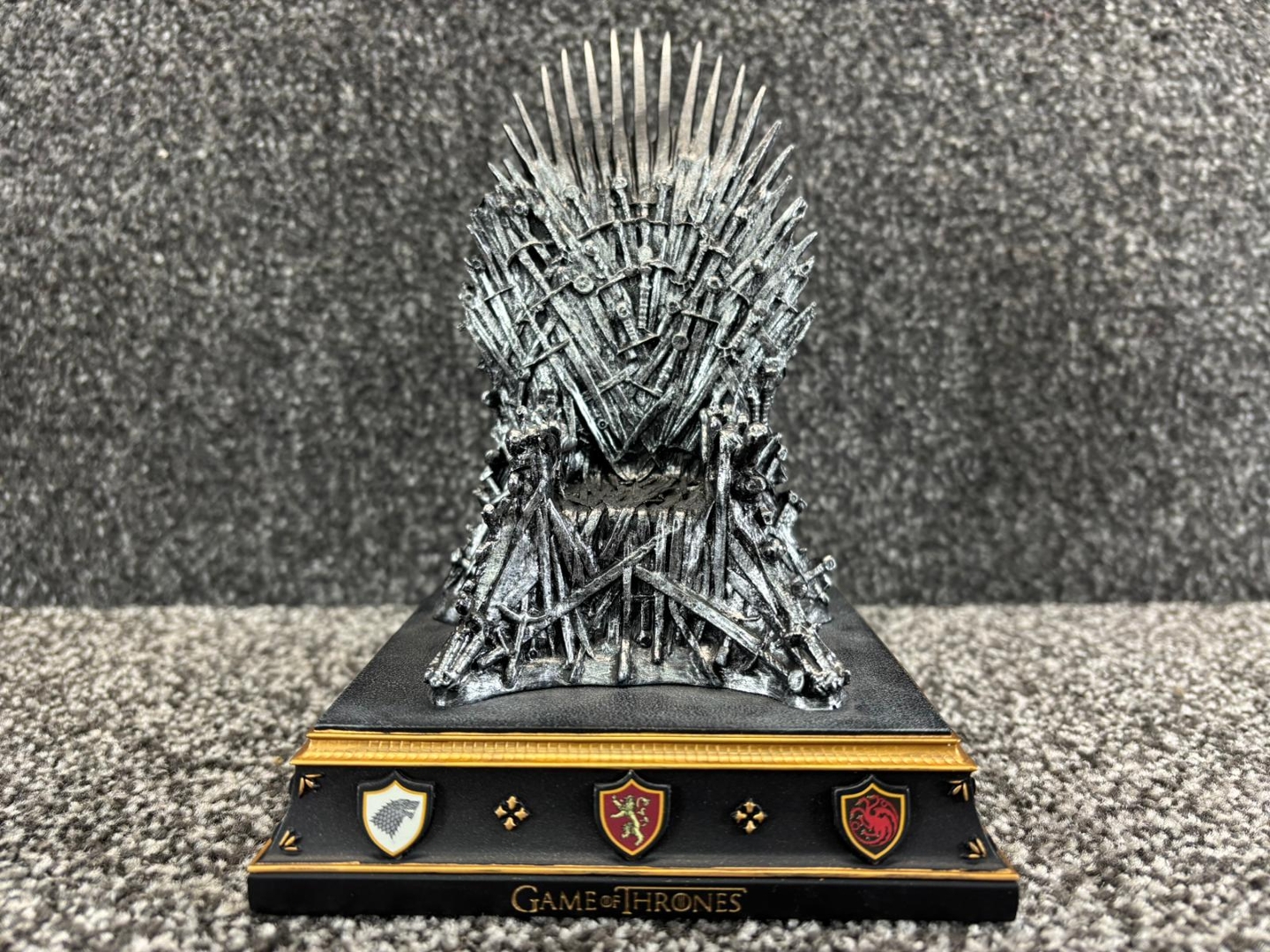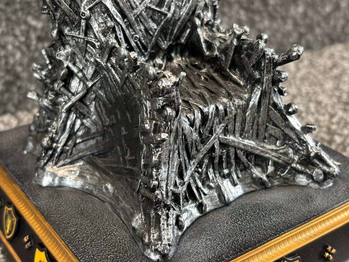 A sculpture of The Iron Throne from The Lord of the Rings Series. Approximately 18cm height, 13cm width, 13cm depth.