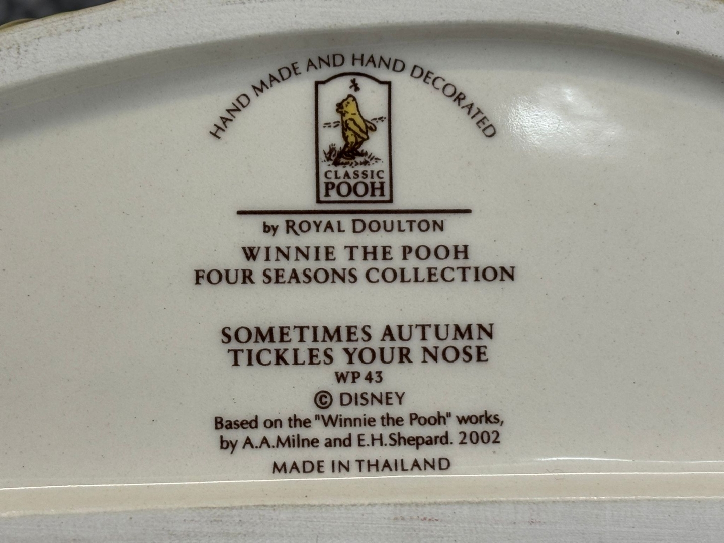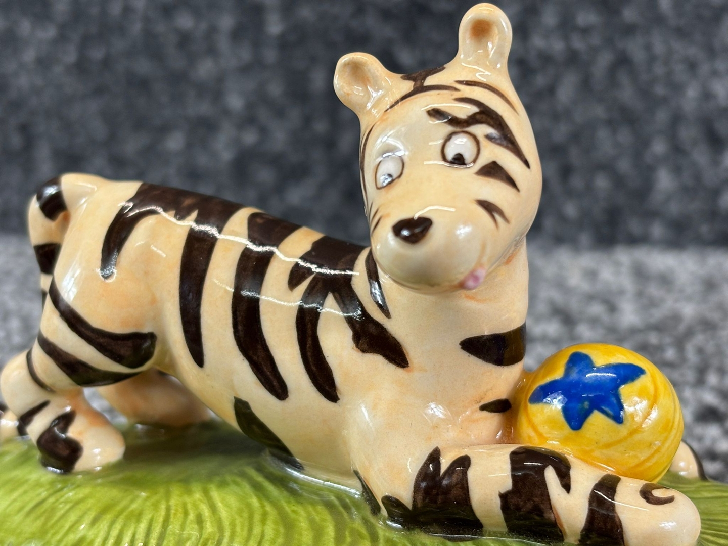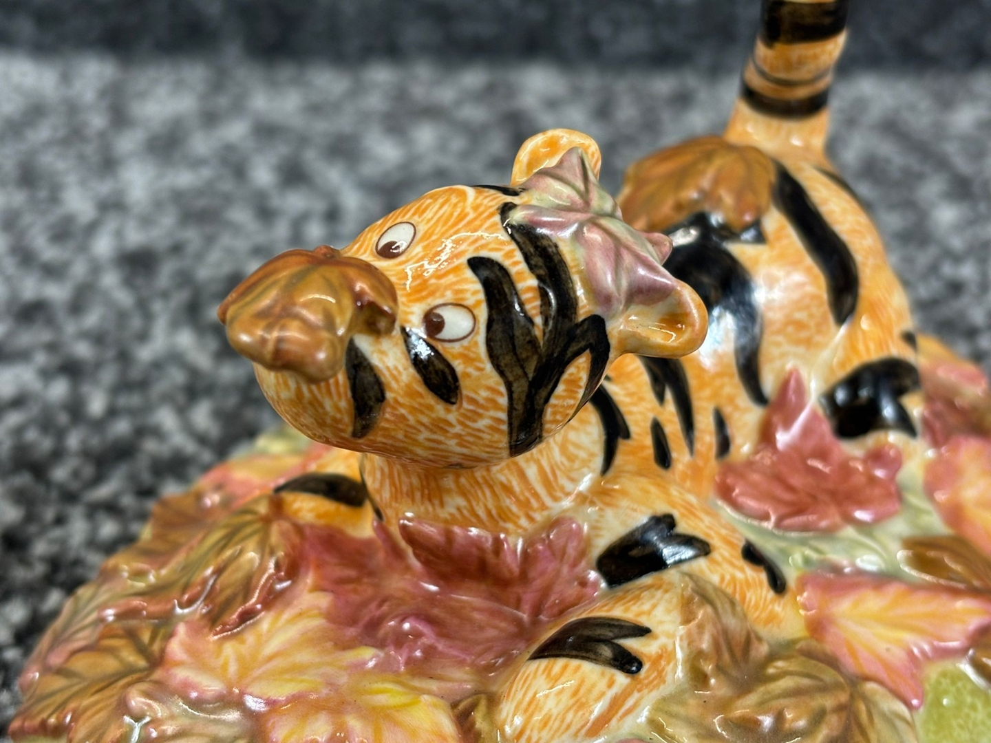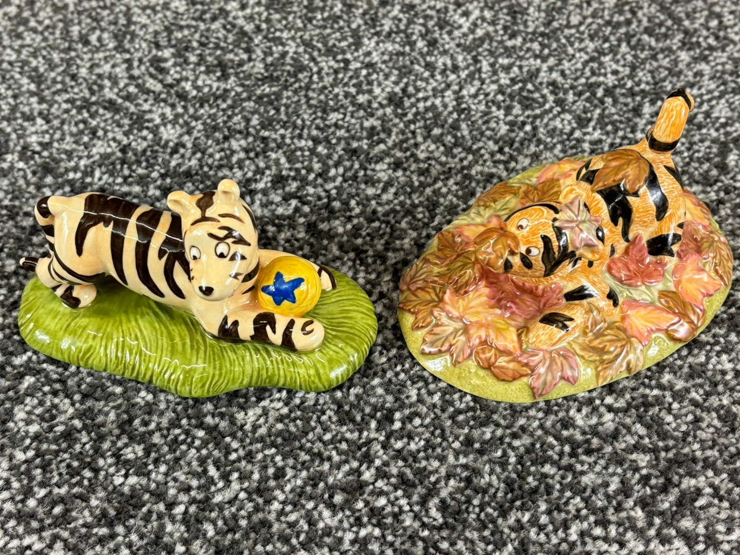 A set of 2 Royal Doulton porcelain sculptures captures the playful spirit of Tigger from Winnie the Pooh in two joy-filled scenes. In one figure, Tigger is caught mid-pounce, playfully crouched with a bright yellow ball by his side, his wide-eyed expression full of mischief. In the second, he’s joyfully hidden among a flurry of autumn leaves, embodying his boundless energy and love for fun.