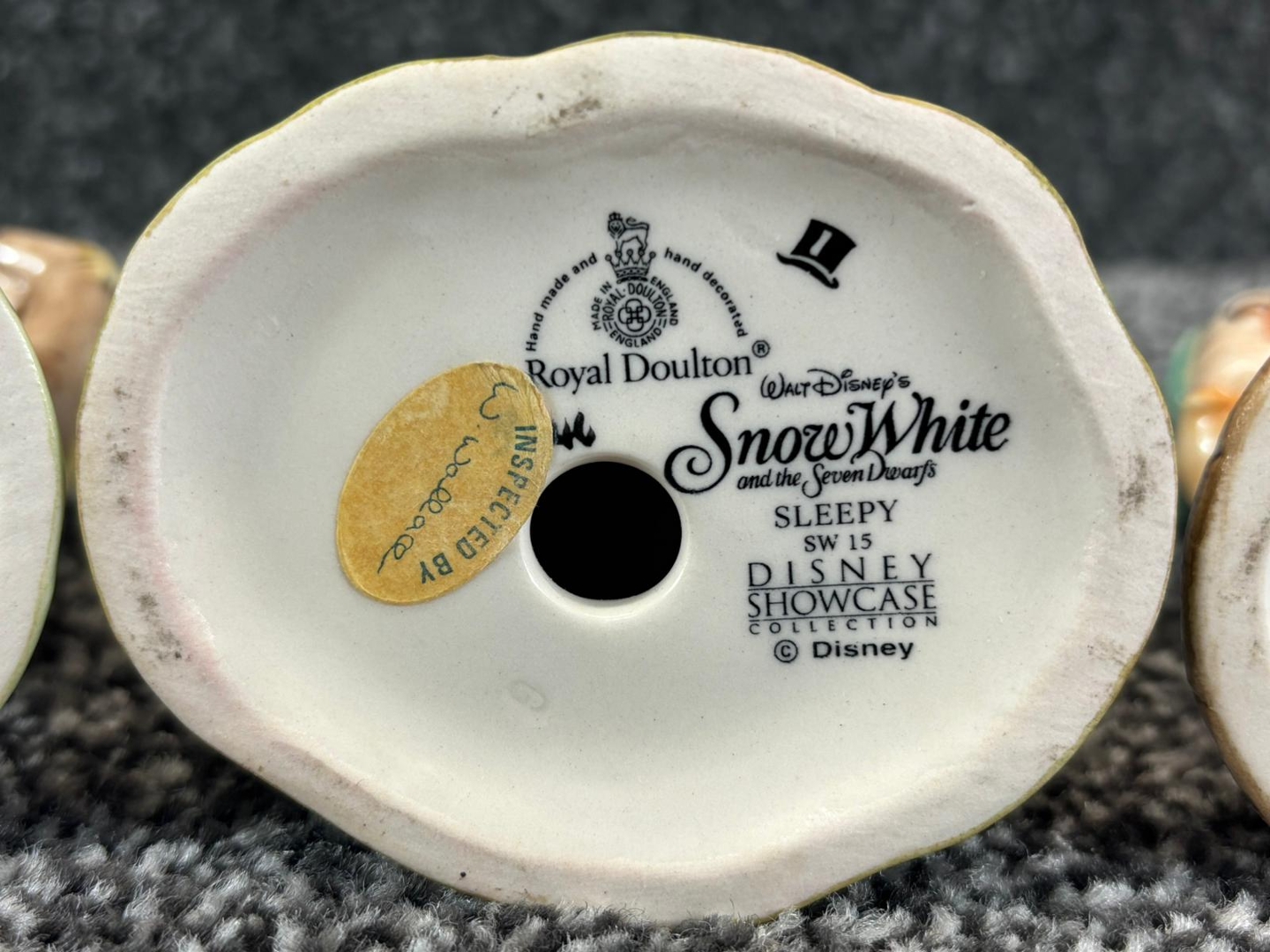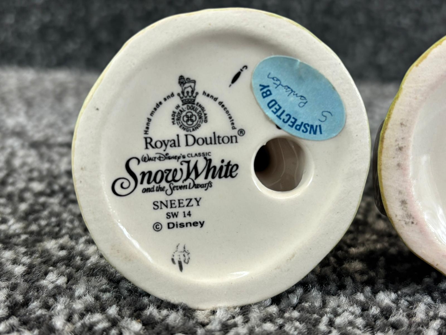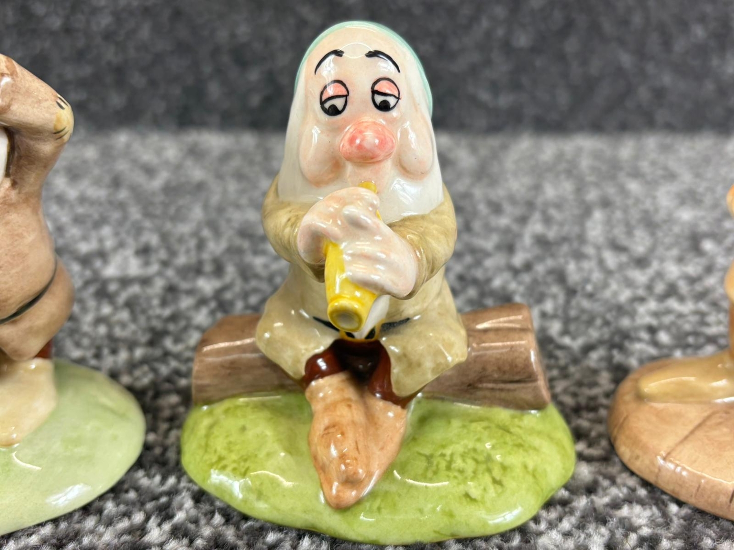 A Set of 3 Royal Doulton Porcelain Sculptures from Snow White & The Seven Dwarfs. These characters include Sneezy, Sleepy & Bashful. Approximately 9cm height, 8cm width, 6cm depth.