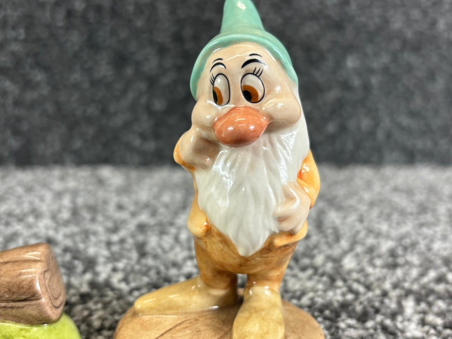 A set of 3 Royal Doulton porcelain sculptures brings the lovable charm of Disney’s Snow White and the Seven Dwarfs to life. Featuring the endearing characters Sneezy, Sleepy, and Bashful, each figurine is beautifully hand-painted with expressive detail and signature personality. From Sneezy mid-sneeze to Sleepy resting on a log with his eyes half-shut, and Bashful shyly blushing with one hand behind his back, these pieces perfectly capture the whimsy and emotion of the classic film.