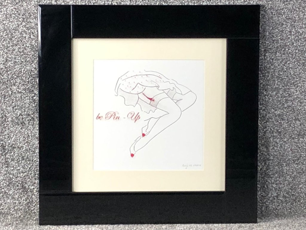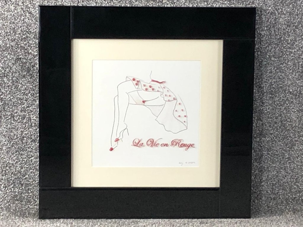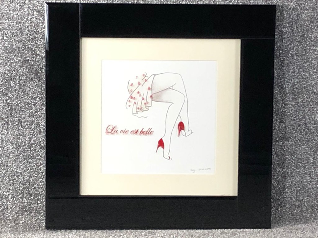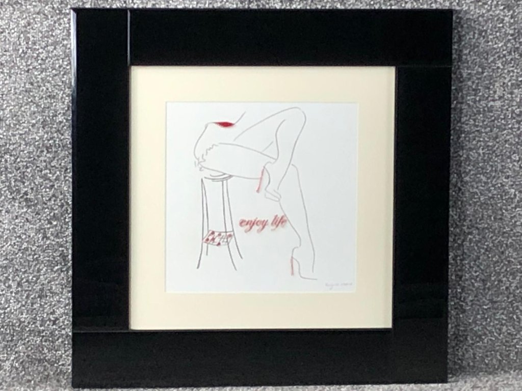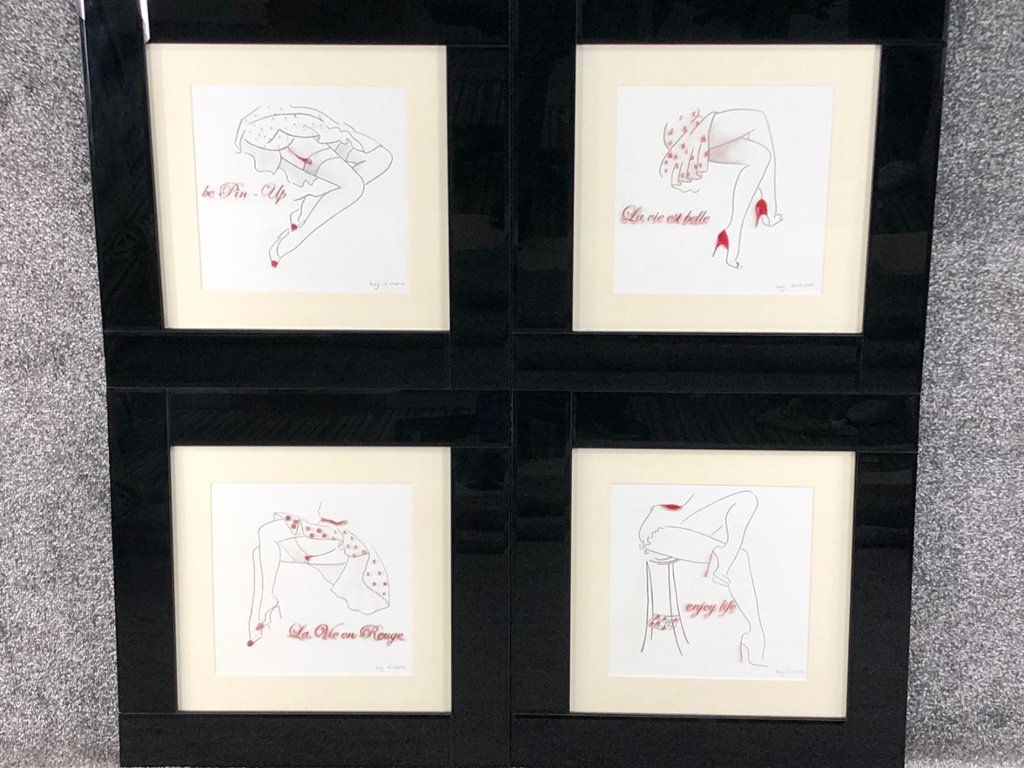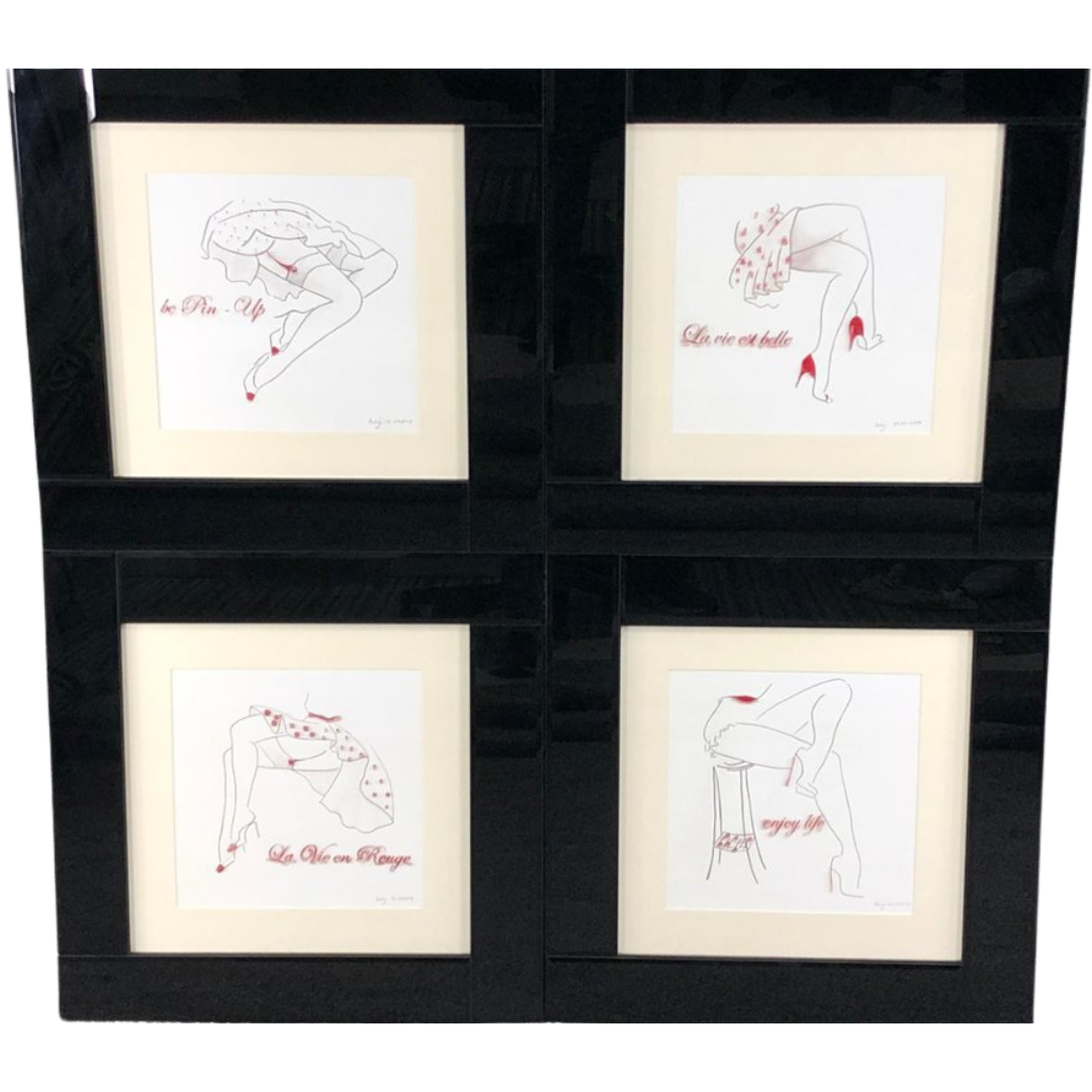 A set of four liquid art pictures by the artist Rosy brings a playful yet elegant touch to any modern space. Each artwork, framed in a sleek bevelled edge black glass frame, captures a minimalist depiction of ladies’ legs paired with chic phrases such as “Be Pin-Up,” “La Vie Est Belle,” “La Vie en Rouge,” and “Enjoy Life.” Measuring approximately 22 inches in height and 22 inches in width, each piece combines line art simplicity with bold red highlights to create a striking visual contrast.