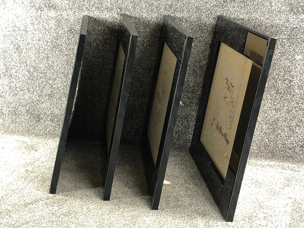 A set of four bevelled edge black glass frame liquid art pictures of Ladies Legs by the artist Rosy. Approximately 22" height, 22" width.