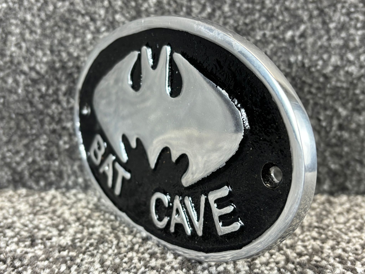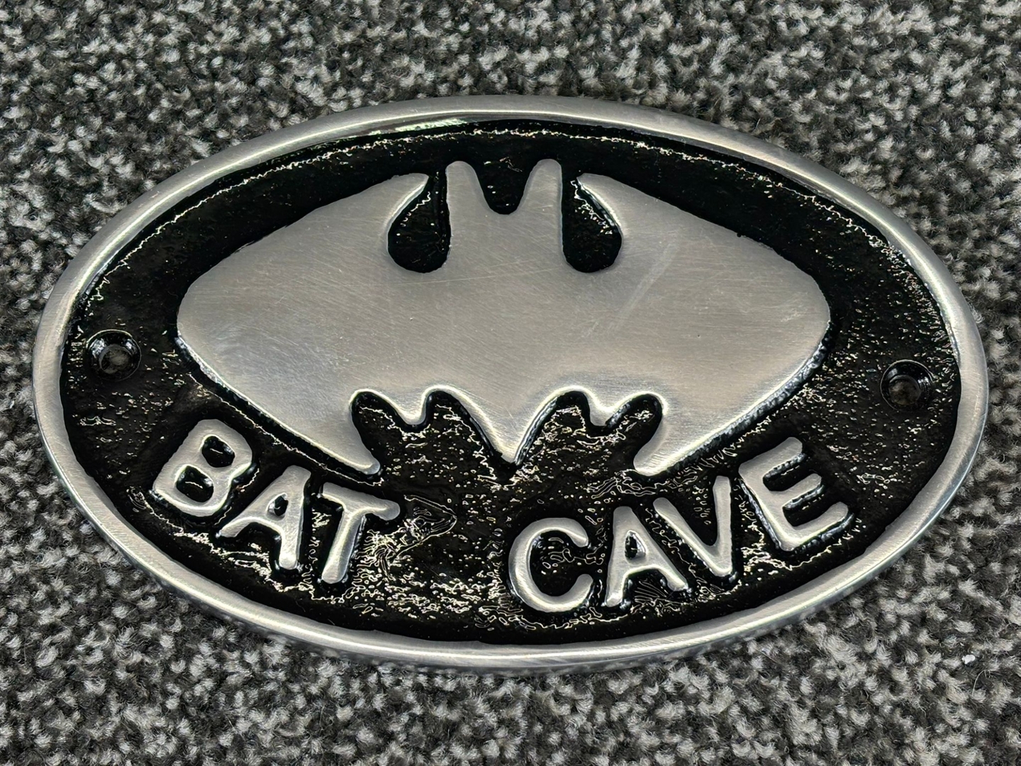 A silver and black metal Bat Cave wall plaque. Approximately 10cm height, 16cm width.