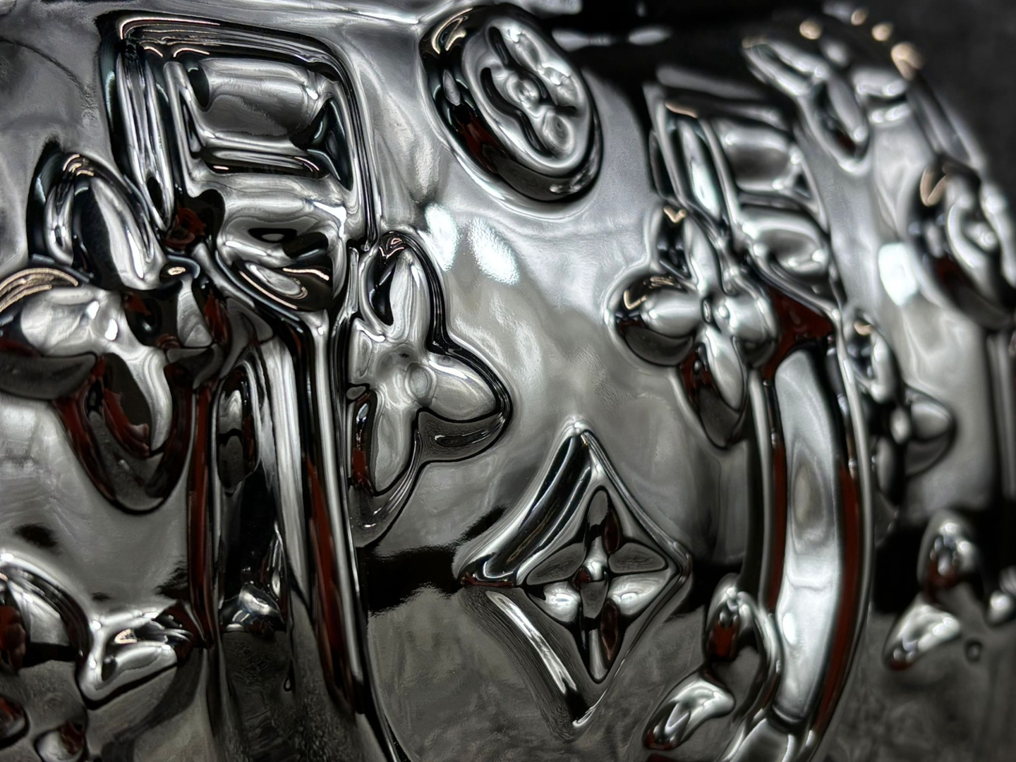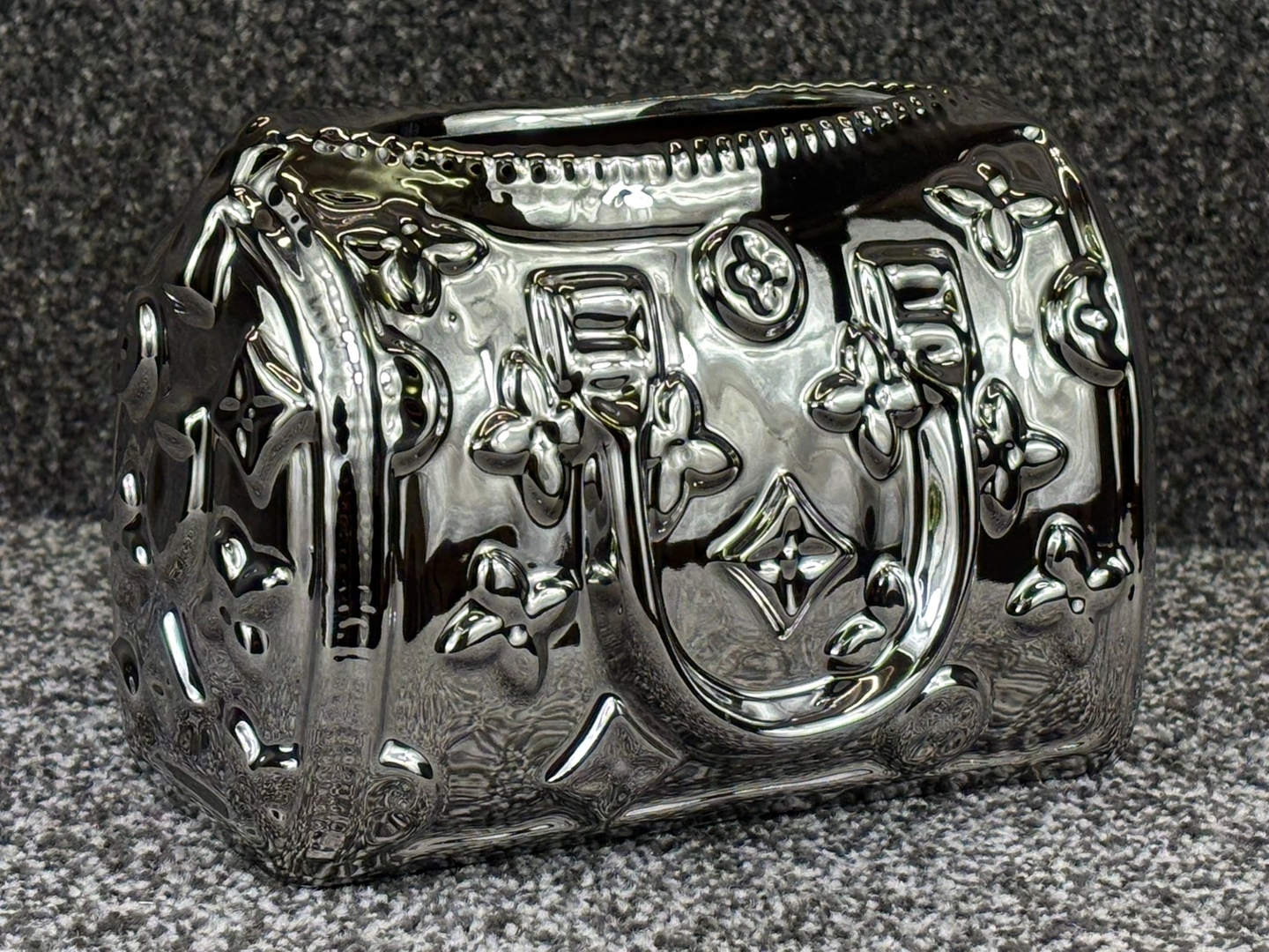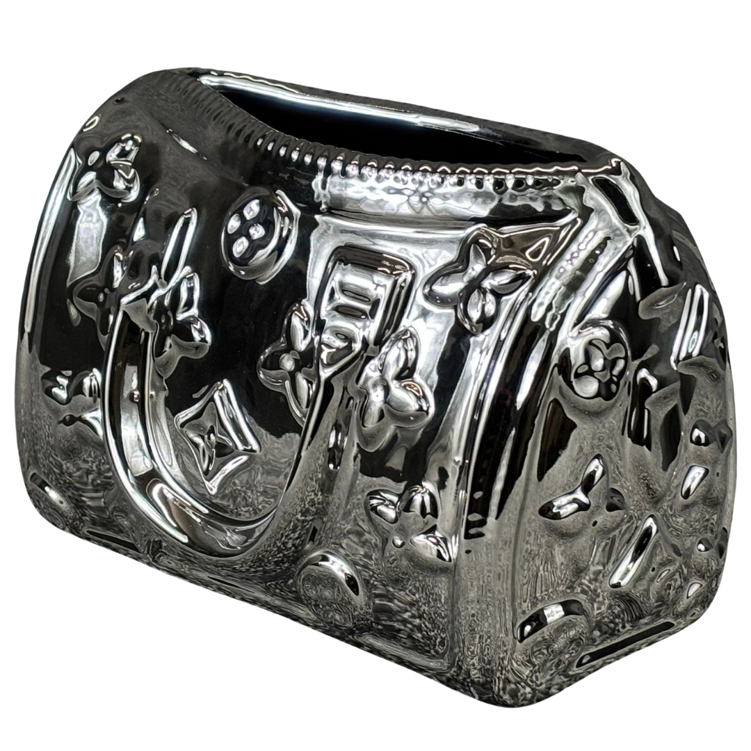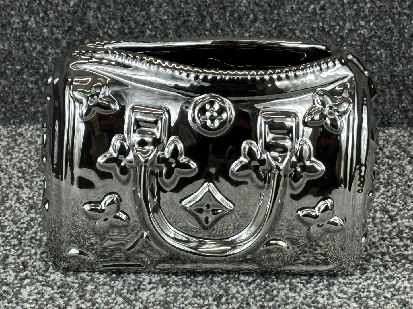 A silver ceramic handbag vase that exudes contemporary style with a playful twist. Crafted in the shape of a handbag, this unique piece features a high-shine metallic silver finish with embossed detailing, giving it depth, texture, and a luxurious appearance. The reflective glaze enhances its sculptural form, making it as much a decorative statement as it is a functional vase.