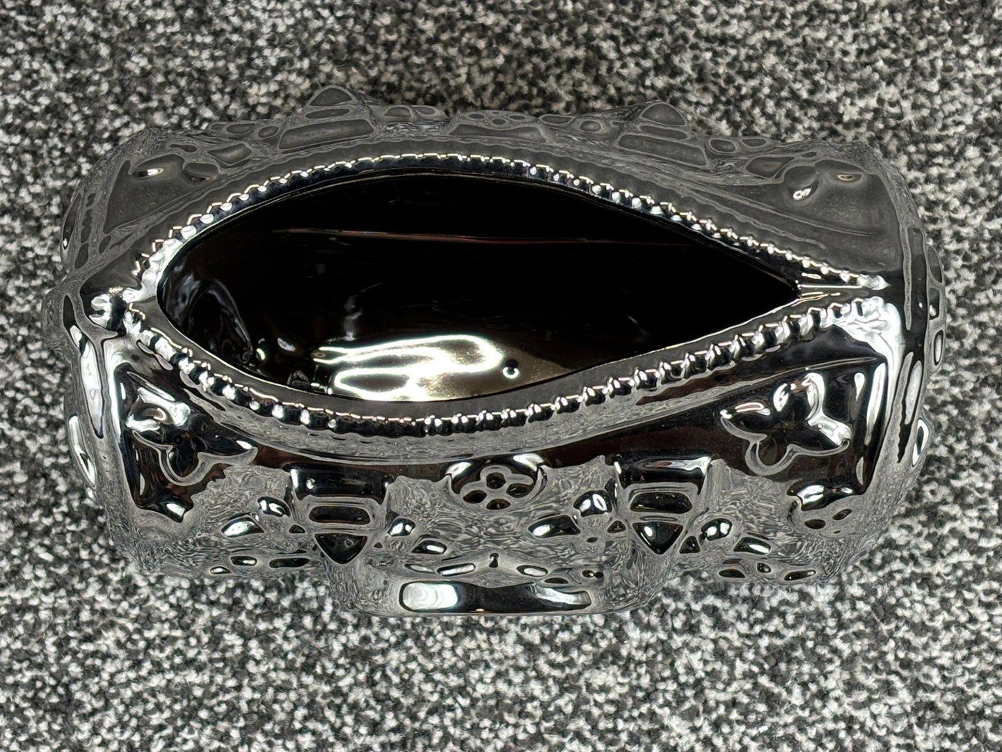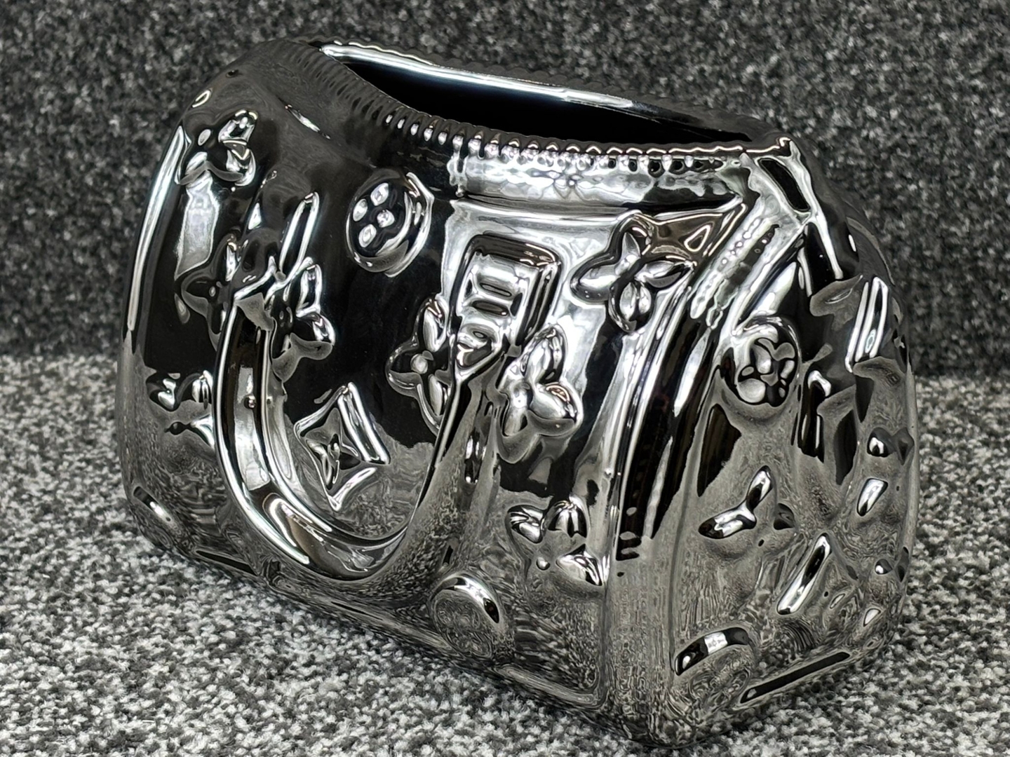 A Silver Ceramic Handbag Vase. Approx 13cm height, 19cm width, 9cm depth.